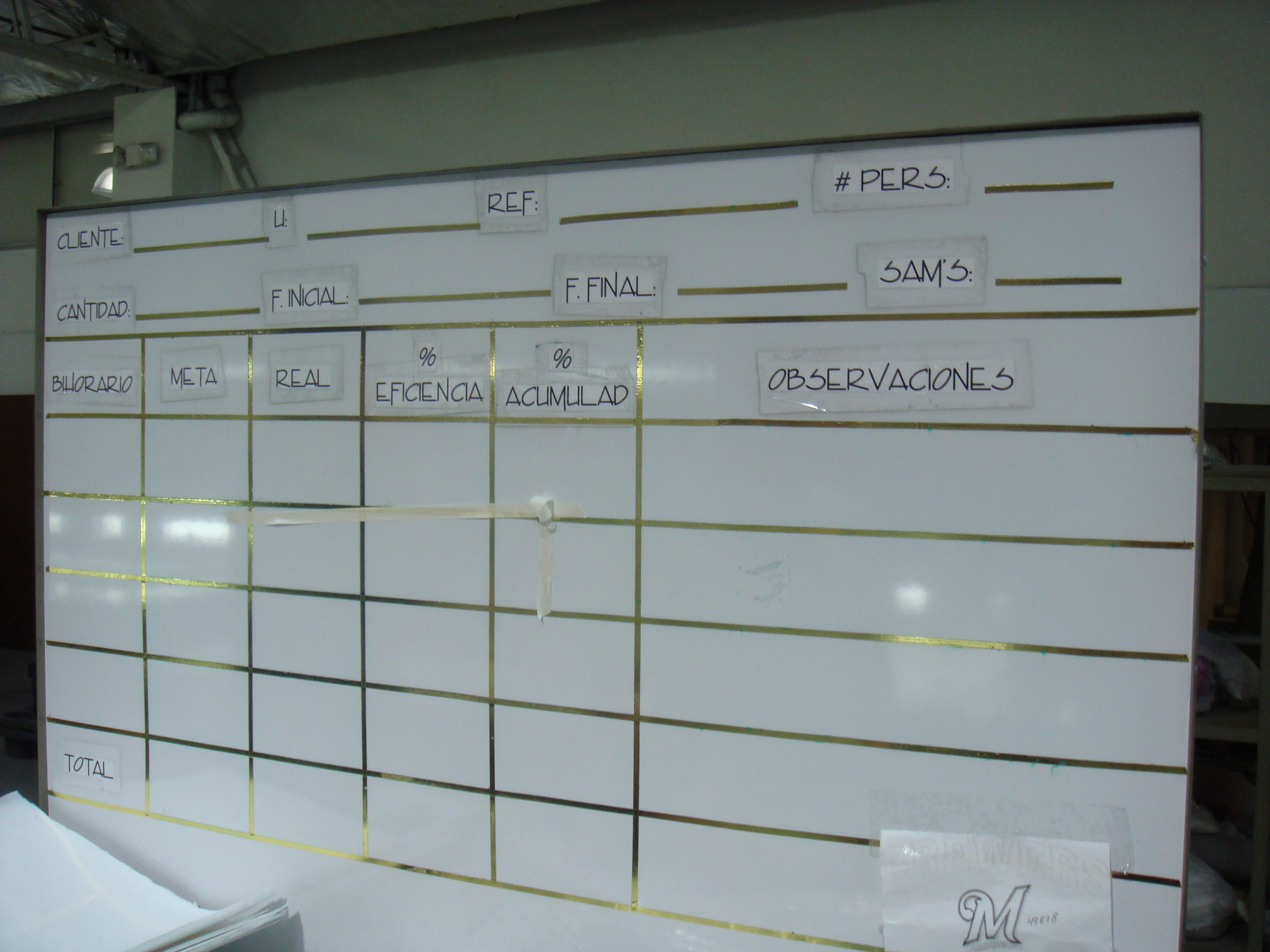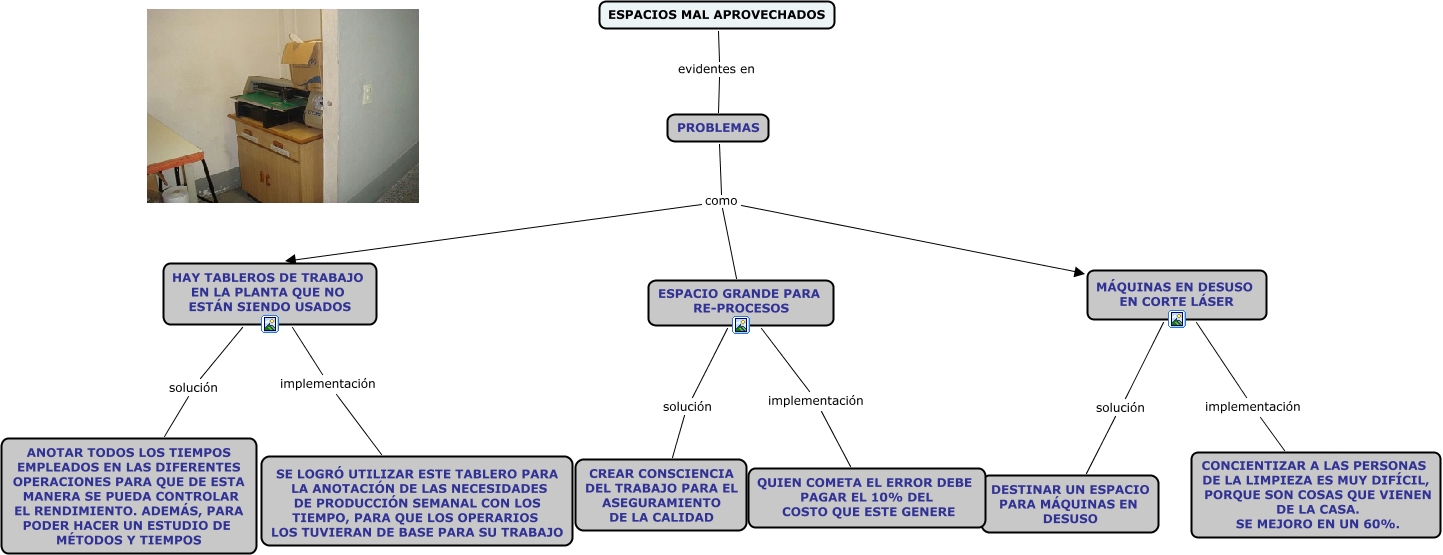 Este Cmap, tiene información relacionada con: ESPACIOS MAL APROVECHADOS, HAY TABLEROS DE TRABAJO EN LA PLANTA QUE NO EST�?N SIENDO USADOS solución ANOTAR TODOS LOS TIEMPOS EMPLEADOS EN LAS DIFERENTES OPERACIONES PARA QUE DE ESTA MANERA SE PUEDA CONTROLAR EL RENDIMIENTO. ADEM�?S, PARA PODER HACER UN ESTUDIO DE MÉTODOS Y TIEMPOS, M�?QUINAS EN DESUSO EN CORTE L�?SER solución DESTINAR UN ESPACIO PARA M�?QUINAS EN DESUSO, ESPACIOS MAL APROVECHADOS evidentes en PROBLEMAS, ESPACIO GRANDE PARA RE-PROCESOS solución CREAR CONSCIENCIA DEL TRABAJO PARA EL ASEGURAMIENTO DE LA CALIDAD, HAY TABLEROS DE TRABAJO EN LA PLANTA QUE NO EST�?N SIENDO USADOS implementación SE LOGRÓ UTILIZAR ESTE TABLERO PARA LA ANOTACIÓN DE LAS NECESIDADES DE PRODUCCIÓN SEMANAL CON LOS TIEMPO, PARA QUE LOS OPERARIOS LOS TUVIERAN DE BASE PARA SU TRABAJO, M�?QUINAS EN DESUSO EN CORTE L�?SER implementación CONCIENTIZAR A LAS PERSONAS DE LA LIMPIEZA ES MUY DIF�?CIL, PORQUE SON COSAS QUE VIENEN DE LA CASA. SE MEJORO EN UN 60%., PROBLEMAS como ESPACIO GRANDE PARA RE-PROCESOS, ESPACIO GRANDE PARA RE-PROCESOS implementación QUIEN COMETA EL ERROR DEBE PAGAR EL 10% DEL COSTO QUE ESTE GENERE, PROBLEMAS como M�?QUINAS EN DESUSO EN CORTE L�?SER, PROBLEMAS como HAY TABLEROS DE TRABAJO EN LA PLANTA QUE NO EST�?N SIENDO USADOS