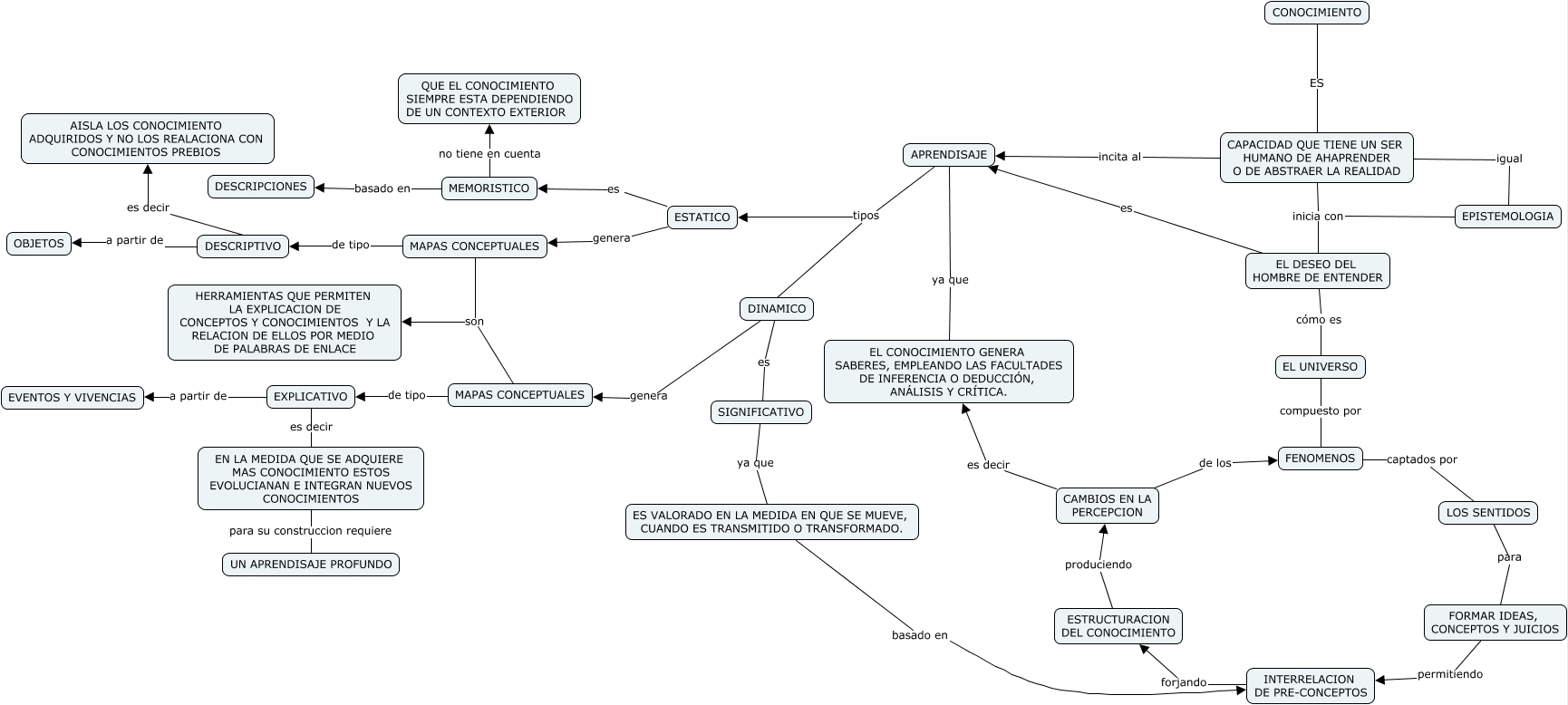 Este Cmap, tiene información relacionada con: El Conocimiento (Mapa de Mapas Conceptuales), CONOCIMIENTO ES CAPACIDAD QUE TIENE UN SER HUMANO DE AHAPRENDER O DE ABSTRAER LA REALIDAD, FORMAR IDEAS, CONCEPTOS Y JUICIOS permitiendo INTERRELACION DE PRE-CONCEPTOS, MAPAS CONCEPTUALES de tipo DESCRIPTIVO, EL DESEO DEL HOMBRE DE ENTENDER es APRENDISAJE, CAPACIDAD QUE TIENE UN SER HUMANO DE AHAPRENDER O DE ABSTRAER LA REALIDAD igual EPISTEMOLOGIA, APRENDISAJE tipos DINAMICO, EL DESEO DEL HOMBRE DE ENTENDER cómo es EL UNIVERSO, ESTRUCTURACION DEL CONOCIMIENTO produciendo CAMBIOS EN LA PERCEPCION, ESTATICO genera MAPAS CONCEPTUALES, CAMBIOS EN LA PERCEPCION de los FENOMENOS, EPISTEMOLOGIA inicia con EL DESEO DEL HOMBRE DE ENTENDER, EXPLICATIVO es decir EN LA MEDIDA QUE SE ADQUIERE MAS CONOCIMIENTO ESTOS EVOLUCIANAN E INTEGRAN NUEVOS CONOCIMIENTOS, MEMORISTICO no tiene en cuenta QUE EL CONOCIMIENTO SIEMPRE ESTA DEPENDIENDO DE UN CONTEXTO EXTERIOR, DINAMICO es SIGNIFICATIVO, MAPAS CONCEPTUALES son HERRAMIENTAS QUE PERMITEN LA EXPLICACION DE CONCEPTOS Y CONOCIMIENTOS Y LA RELACION DE ELLOS POR MEDIO DE PALABRAS DE ENLACE, EL UNIVERSO compuesto por FENOMENOS, EN LA MEDIDA QUE SE ADQUIERE MAS CONOCIMIENTO ESTOS EVOLUCIANAN E INTEGRAN NUEVOS CONOCIMIENTOS para su construccion requiere UN APRENDISAJE PROFUNDO, EXPLICATIVO a partir de EVENTOS Y VIVENCIAS, APRENDISAJE tipos ESTATICO, DINAMICO genera MAPAS CONCEPTUALES