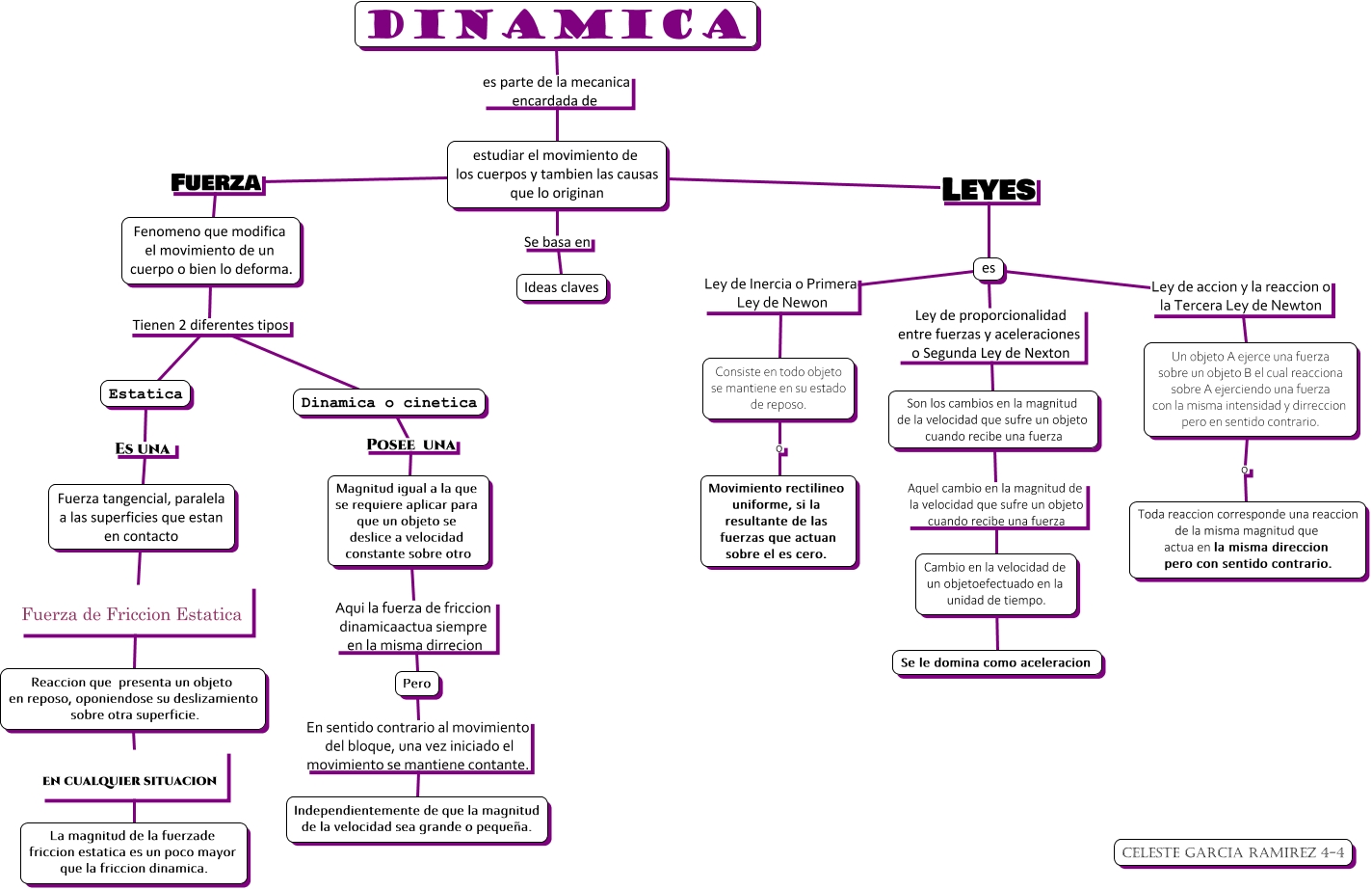 Este Cmap, tiene información relacionada con: Mapas conceptuales, Cambio en la velocidad de un objetoefectuado en la unidad de tiempo. ???? Se le domina como aceleracion, Magnitud igual a la que se requiere aplicar para que un objeto se deslice a velocidad constante sobre otro Aqui la fuerza de friccion dinamicaactua siempre en la misma dirrecion Pero, estudiar el movimiento de los cuerpos y tambien las causas que lo originan Se basa en Ideas claves, es Ley de proporcionalidad entre fuerzas y aceleraciones o Segunda Ley de Nexton Son los cambios en la magnitud de la velocidad que sufre un objeto cuando recibe una fuerza, estudiar el movimiento de los cuerpos y tambien las causas que lo originan Leyes es, Fenomeno que modifica el movimiento de un cuerpo o bien lo deforma. Tienen 2 diferentes tipos Dinamica o cinetica, es Ley de Inercia o Primera Ley de Newon Consiste en todo objeto se mantiene en su estado de reposo., Reaccion que presenta un objeto en reposo, oponiendose su deslizamiento sobre otra superficie. en cualquier situacion La magnitud de la fuerzade friccion estatica es un poco mayor que la friccion dinamica., estudiar el movimiento de los cuerpos y tambien las causas que lo originan Fuerza Fenomeno que modifica el movimiento de un cuerpo o bien lo deforma., es Ley de accion y la reaccion o la Tercera Ley de Newton Un objeto A ejerce una fuerza sobre un objeto B el cual reacciona sobre A ejerciendo una fuerza con la misma intensidad y dirreccion pero en sentido contrario., Consiste en todo objeto se mantiene en su estado de reposo. o Movimiento rectilineo uniforme, si la resultante de las fuerzas que actuan sobre el es cero., Pero En sentido contrario al movimiento del bloque, una vez iniciado el movimiento se mantiene contante. Independientemente de que la magnitud de la velocidad sea grande o pequeña., Dinamica es parte de la mecanica encardada de estudiar el movimiento de los cuerpos y tambien las causas que lo originan, Estatica Es una Fuerza tangencial, paralela a las superficies que estan en contacto, Son los cambios en la magnitud de la velocidad que sufre un objeto cuando recibe una fuerza Aquel cambio en la magnitud de la velocidad que sufre un objeto cuando recibe una fuerza Cambio en la velocidad de un objetoefectuado en la unidad de tiempo., Fuerza tangencial, paralela a las superficies que estan en contacto Fuerza de Friccion Estatica Reaccion que presenta un objeto en reposo, oponiendose su deslizamiento sobre otra superficie., Dinamica o cinetica Posee una Magnitud igual a la que se requiere aplicar para que un objeto se deslice a velocidad constante sobre otro, Fenomeno que modifica el movimiento de un cuerpo o bien lo deforma. Tienen 2 diferentes tipos Estatica, Un objeto A ejerce una fuerza sobre un objeto B el cual reacciona sobre A ejerciendo una fuerza con la misma intensidad y dirreccion pero en sentido contrario. o Toda reaccion corresponde una reaccion de la misma magnitud que actua en la misma direccion pero con sentido contrario.