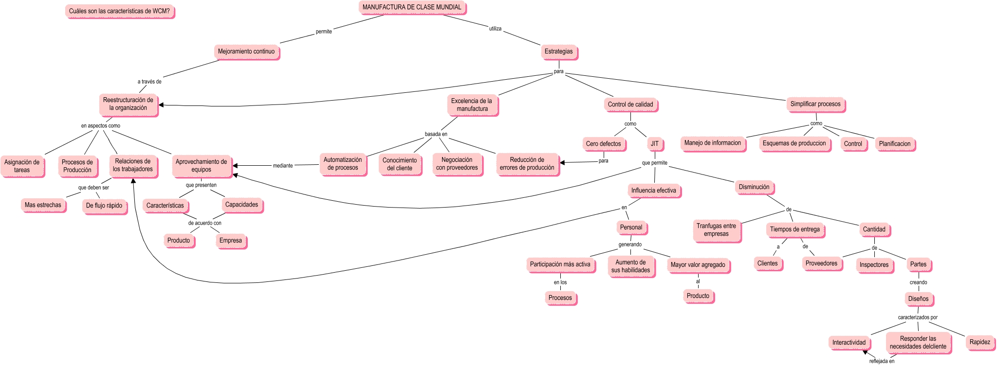 Este Cmap, tiene información relacionada con: WCM, Control de calidad como JIT, JIT que permite Disminución, Simplificar procesos como Esquemas de produccion, Estrategias para Simplificar procesos, Control de calidad como Cero defectos, Partes creando Diseños, Cero defectos para Reducción de errores de producción, Excelencia de la manufactura basada en Reducción de errores de producción, Características de acuerdo con Empresa, Simplificar procesos como Control, JIT que permite Aprovechamiento de equipos, Aprovechamiento de equipos que presenten Características, Simplificar procesos como Manejo de informacion, Aprovechamiento de equipos que presenten Capacidades, Personal generando Aumento de sus habilidades, Diseños caracterizados por Responder las necesidades delcliente, MANUFACTURA DE CLASE MUNDIAL utiliza Estrategias, Simplificar procesos como Planificacion, Cantidad de Proveedores, Participación más activa en los Procesos
