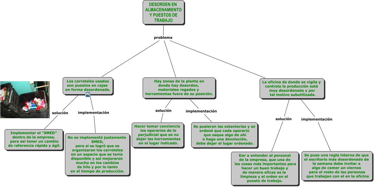 Este Cmap, tiene información relacionada con: DESODEN, DESORDEN EN ALMACENAMIENTO Y PUESTOS DE TRABAJO problema La oficina de donde se vigila y controla la producción está muy desordenada y por tal motivo subutilizada., Los carreteles usados son puestos en cajas en forma desordenada. solución Implementar el “SMED�? dentro de la empresa, para así tener un cambio de referencia rápido y ágil., Los carreteles usados son puestos en cajas en forma desordenada. implementación No se implementó justamente SMED, pero si se logró que se organizaran los carreteles en un espacio que se tenía disponible y así mejoraron mucho en los cambios de hilo y por lo tanto en el tiempo de producción., Hay zonas de la planta en donde hay desorden, materiales regados y herramientas fuera de su posición. solución Hacer tomar conciencia los operarios de lo perjudicial que es no dejar las herramientas en el lugar indicado., La oficina de donde se vigila y controla la producción está muy desordenada y por tal motivo subutilizada. solución Dar a entender al personal de la empresa, que una de las cosas más importantes para hacer un buen trabajo y de manera eficaz es la limpieza y el orden en el puesto de trabajo., Hay zonas de la planta en donde hay desorden, materiales regados y herramientas fuera de su posición. implementación Se pusieron las estanterías y se ordenó que cada operario que saque algo de ahí o haga una devolución, debe dejar el lugar ordenado., DESORDEN EN ALMACENAMIENTO Y PUESTOS DE TRABAJO problema Los carreteles usados son puestos en cajas en forma desordenada., La oficina de donde se vigila y controla la producción está muy desordenada y por tal motivo subutilizada. implementación Se puso una regla interna de que el escritorio más desordenado de la semana debe invitar a algo de comer un viernes para el resto de las personas que trabajan con el en la oficina, DESORDEN EN ALMACENAMIENTO Y PUESTOS DE TRABAJO problema Hay zonas de la planta en donde hay desorden, materiales regados y herramientas fuera de su posición.