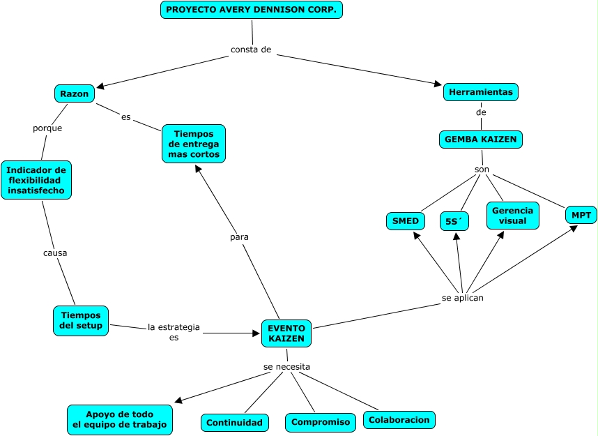 Este Cmap, tiene información relacionada con: AVERY DENNISON CORP, EVENTO KAIZEN se aplican Gerencia visual, EVENTO KAIZEN se necesita Compromiso, EVENTO KAIZEN para Tiempos de entrega mas cortos, EVENTO KAIZEN se aplican MPT, EVENTO KAIZEN se aplican SMED, EVENTO KAIZEN se necesita Continuidad, EVENTO KAIZEN se aplican 5S´, EVENTO KAIZEN se necesita Apoyo de todo el equipo de trabajo, Tiempos del setup la estrategia es EVENTO KAIZEN, Indicador de flexibilidad insatisfecho causa Tiempos del setup, PROYECTO AVERY DENNISON CORP. consta de Razon, PROYECTO AVERY DENNISON CORP. consta de Herramientas, GEMBA KAIZEN son Gerencia visual, Razon porque Indicador de flexibilidad insatisfecho, GEMBA KAIZEN son SMED, EVENTO KAIZEN se necesita Colaboracion, GEMBA KAIZEN son MPT, Razon es Tiempos de entrega mas cortos, GEMBA KAIZEN son 5S´, Herramientas de GEMBA KAIZEN