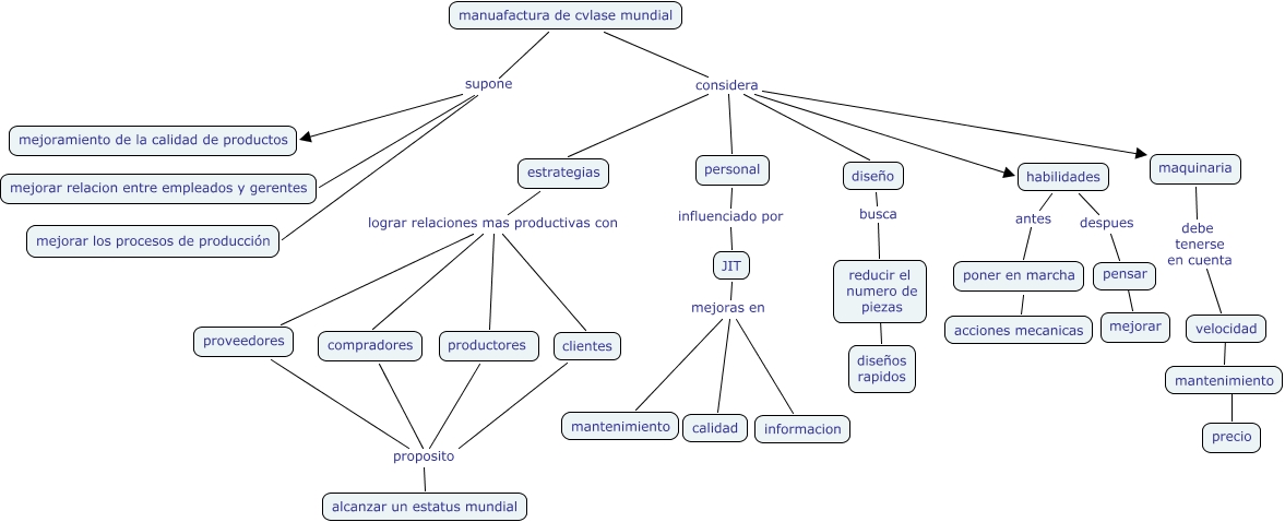 Este Cmap, tiene información relacionada con: manufactira de clase mundial, JIT mejoras en calidad, estrategias lograr relaciones mas productivas con compradores, diseño busca reducir el numero de piezas, compradores proposito alcanzar un estatus mundial, velocidad ???? mantenimiento, manuafactura de cvlase mundial considera personal, manuafactura de cvlase mundial considera diseño, manuafactura de cvlase mundial supone mejorar relacion entre empleados y gerentes, manuafactura de cvlase mundial considera habilidades, poner en marcha ???? acciones mecanicas, manuafactura de cvlase mundial considera maquinaria, estrategias lograr relaciones mas productivas con proveedores, mantenimiento ???? precio, manuafactura de cvlase mundial considera estrategias, estrategias lograr relaciones mas productivas con clientes, manuafactura de cvlase mundial supone mejorar los procesos de producción, proveedores proposito alcanzar un estatus mundial, manuafactura de cvlase mundial supone mejoramiento de la calidad de productos, reducir el numero de piezas ???? diseños rapidos, JIT mejoras en informacion