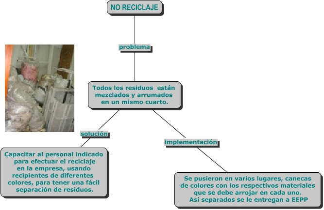 Este Cmap, tiene información relacionada con: NO_RECICLAJE, NO RECICLAJE problema Todos los residuos están mezclados y arrumados en un mismo cuarto., Todos los residuos están mezclados y arrumados en un mismo cuarto. solución Capacitar al personal indicado para efectuar el reciclaje en la empresa, usando recipientes de diferentes colores, para tener una fácil separación de residuos., Todos los residuos están mezclados y arrumados en un mismo cuarto. implementación Se pusieron en varios lugares, canecas de colores con los respectivos materiales que se debe arrojar en cada uno. Así separados se le entregan a EEPP