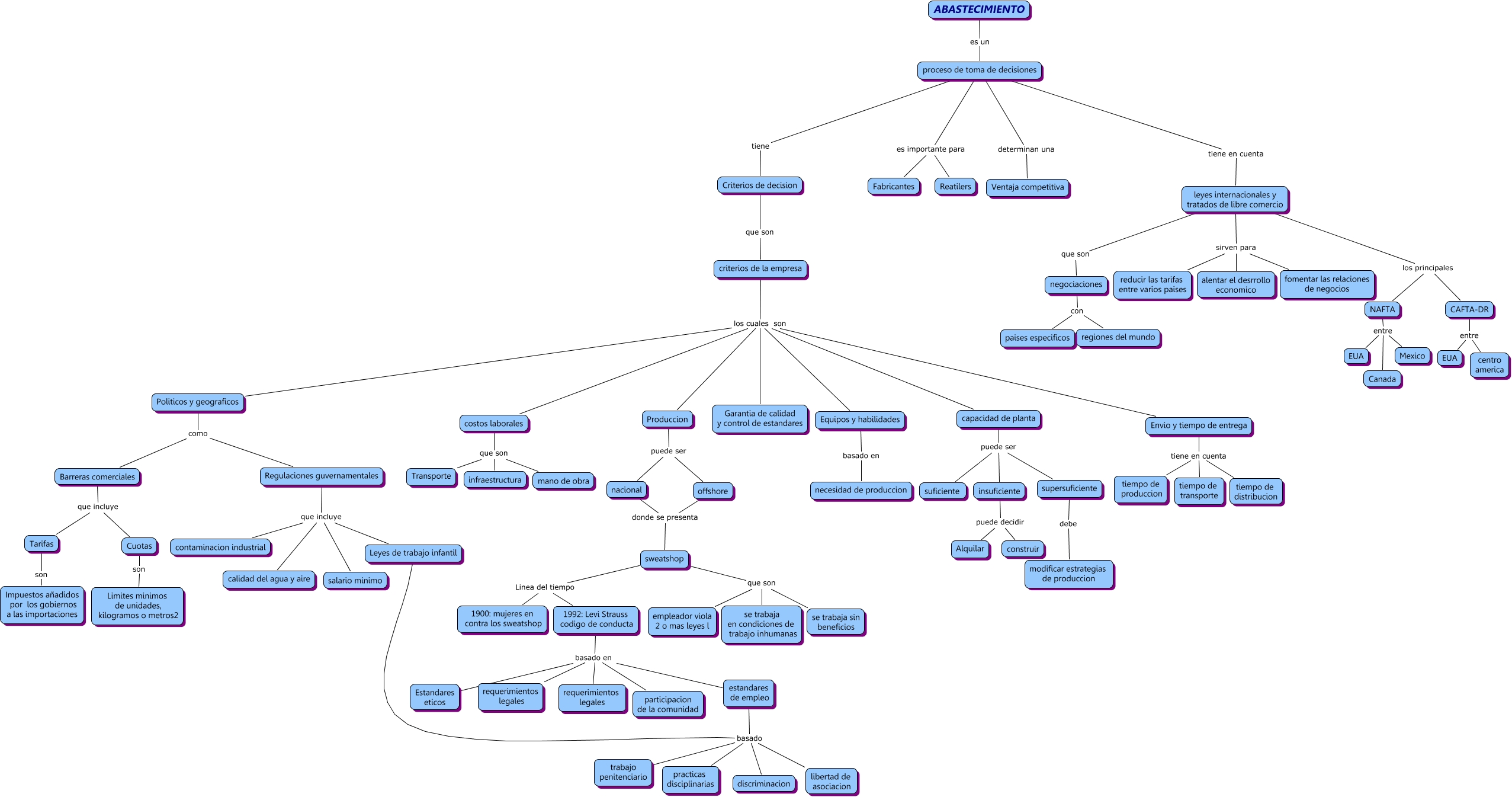 Este Cmap, tiene información relacionada con: Mapa confeccion, proceso de toma de decisiones es importante para Reatilers, sweatshop Linea del tiempo 1992: Levi Strauss codigo de conducta, costos laborales que son mano de obra, insuficiente puede decidir construir, Envio y tiempo de entrega tiene en cuenta tiempo de produccion, negociaciones con paises especificos, NAFTA entre EUA, leyes internacionales y tratados de libre comercio que son negociaciones, leyes internacionales y tratados de libre comercio sirven para alentar el desrrollo economico, 1992: Levi Strauss codigo de conducta basado en participacion de la comunidad, CAFTA-DR entre EUA, 1992: Levi Strauss codigo de conducta basado en requerimientos legales, proceso de toma de decisiones determinan una Ventaja competitiva, 1992: Levi Strauss codigo de conducta basado en requerimientos legales, Regulaciones guvernamentales que incluye Leyes de trabajo infantil, leyes internacionales y tratados de libre comercio sirven para reducir las tarifas entre varios paises, nacional donde se presenta sweatshop, Barreras comerciales que incluye Cuotas, Tarifas son Impuestos añadidos por los gobiernos a las importaciones, sweatshop Linea del tiempo 1900: mujeres en contra los sweatshop