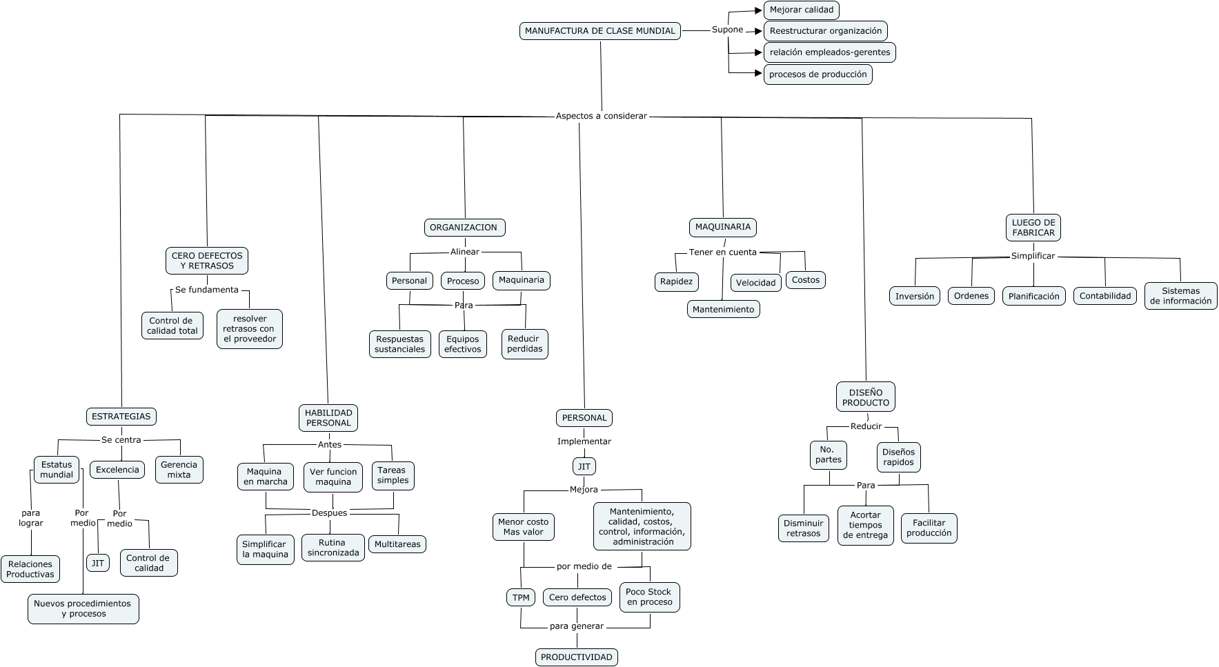 Este Cmap, tiene información relacionada con: WCM, ORGANIZACION Alinear Proceso, HABILIDAD PERSONAL Antes Tareas simples, JIT Mejora Menor costo Mas valor, ESTRATEGIAS Se centra Excelencia, Menor costo Mas valor por medio de Poco Stock en proceso, TPM para generar PRODUCTIVIDAD, MAQUINARIA Tener en cuenta Velocidad, Tareas simples Despues Simplificar la maquina, MANUFACTURA DE CLASE MUNDIAL Aspectos a considerar DISEÑO PRODUCTO, Maquinaria Para Equipos efectivos, LUEGO DE FABRICAR Simplificar Contabilidad, Maquinaria Para Reducir perdidas, DISEÑO PRODUCTO Reducir No. partes, Estatus mundial para lograr Relaciones Productivas, Maquina en marcha Despues Rutina sincronizada, Poco Stock en proceso para generar PRODUCTIVIDAD, Personal Para Reducir perdidas, LUEGO DE FABRICAR Simplificar Sistemas de información, Maquinaria Para Respuestas sustanciales, MANUFACTURA DE CLASE MUNDIAL Supone procesos de producción