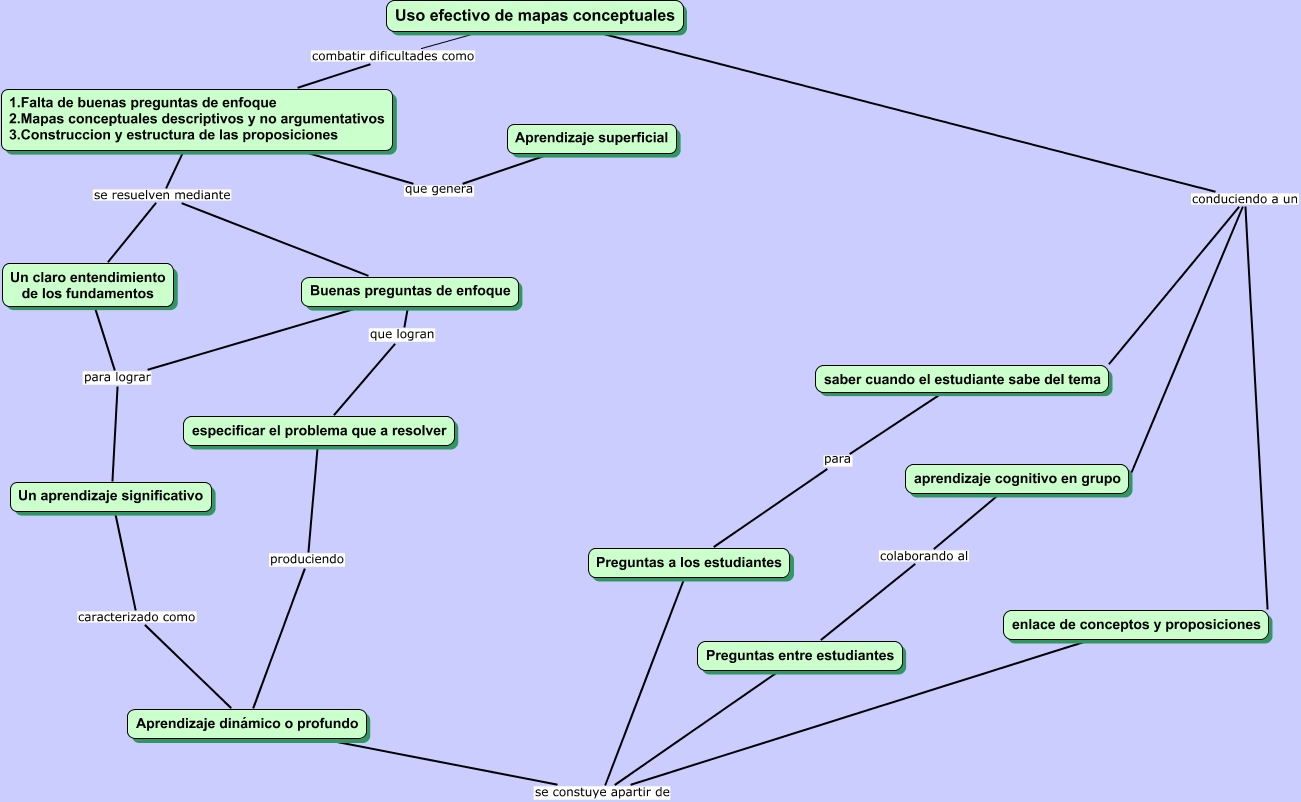 Este Cmap, tiene información relacionada con: Mapas Conceptuales, Un claro entendimiento de los fundamentos se resuelven mediante Buenas preguntas de enfoque, Buenas preguntas de enfoque que logran especificar el problema que a resolver, Un aprendizaje significativo caracterizado como Aprendizaje dinámico o profundo, 1.Falta de buenas preguntas de enfoque 2.Mapas conceptuales descriptivos y no argumentativos 3.Construccion y estructura de las proposiciones que genera Aprendizaje superficial, Preguntas entre estudiantes colaborando al aprendizaje cognitivo en grupo, Aprendizaje dinámico o profundo se constuye apartir de Preguntas entre estudiantes, especificar el problema que a resolver produciendo Aprendizaje dinámico o profundo, Aprendizaje dinámico o profundo se constuye apartir de enlace de conceptos y proposiciones, 1.Falta de buenas preguntas de enfoque 2.Mapas conceptuales descriptivos y no argumentativos 3.Construccion y estructura de las proposiciones se resuelven mediante Buenas preguntas de enfoque, enlace de conceptos y proposiciones conduciendo a un saber cuando el estudiante sabe del tema, Buenas preguntas de enfoque para lograr Un aprendizaje significativo, Preguntas a los estudiantes para saber cuando el estudiante sabe del tema, aprendizaje cognitivo en grupo conduciendo a un saber cuando el estudiante sabe del tema, Uso efectivo de mapas conceptuales conduciendo a un saber cuando el estudiante sabe del tema, Buenas preguntas de enfoque para lograr Un claro entendimiento de los fundamentos, Uso efectivo de mapas conceptuales combatir dificultades como 1.Falta de buenas preguntas de enfoque 2.Mapas conceptuales descriptivos y no argumentativos 3.Construccion y estructura de las proposiciones, Aprendizaje dinámico o profundo se constuye apartir de Preguntas a los estudiantes