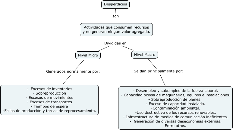 Este Cmap, tiene información relacionada con: Desperdicios, Actividades que consumen recursos y no generan ningun valor agregado. Divididas en Nivel Macro, Nivel Micro Generados normalmente por: - Excesos de inventarios - Sobreproducción - Excesos de movimientos - Excesos de transportes - Tiempos de espera -Fallas de producción y tareas de reprocesamiento., Nivel Macro Se dan principalmente por: - Desempleo y subempleo de la fuerza laboral. - Capacidad ociosa de maquinarias, equipos e instalaciones. - Sobreproducción de bienes. - Exceso de capacidad instalada. -Contaminación ambiental. -Uso destructivo de los recursos renovables. - Infraestructura de medios de comunicación ineficientes. - Generación de diversas deseconomías externas. Entre otros., Desperdicios son Actividades que consumen recursos y no generan ningun valor agregado., Actividades que consumen recursos y no generan ningun valor agregado. Divididas en Nivel Micro