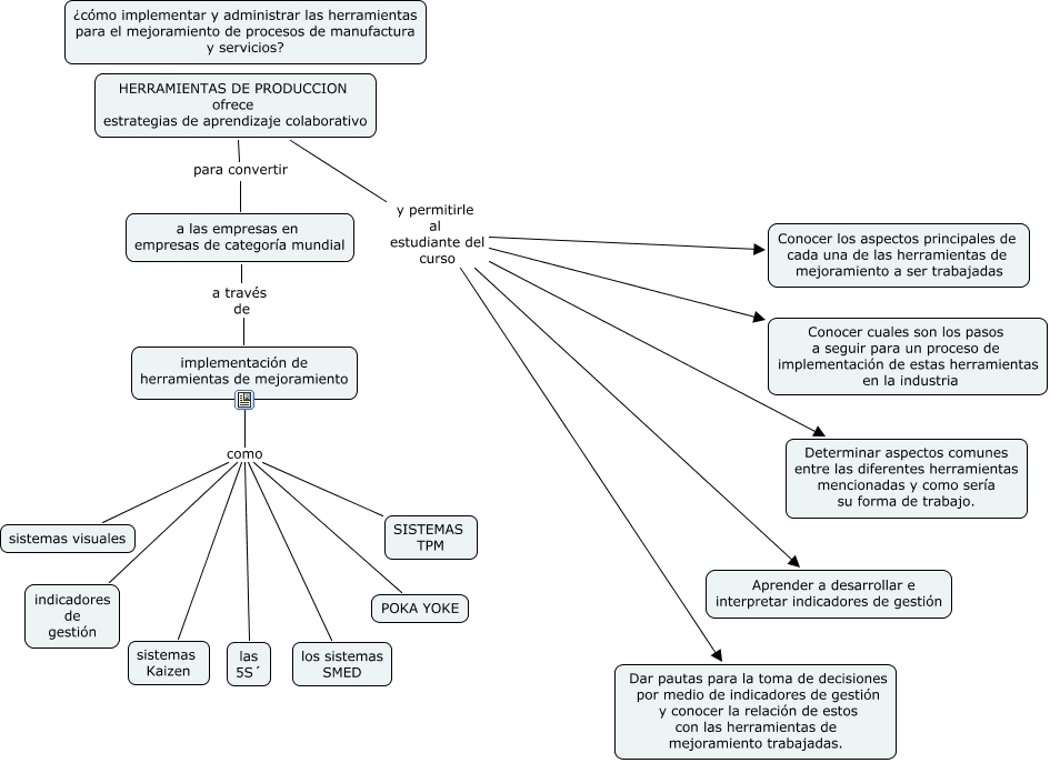 Este Cmap, tiene información relacionada con: HERRAMIENTAS DE PRODUCCION 2009, implementación de herramientas de mejoramiento como SISTEMAS TPM, HERRAMIENTAS DE PRODUCCION ofrece estrategias de aprendizaje colaborativo y permitirle al estudiante del curso Aprender a desarrollar e interpretar indicadores de gestión, implementación de herramientas de mejoramiento como las 5S´, a las empresas en empresas de categoría mundial a través de implementación de herramientas de mejoramiento, HERRAMIENTAS DE PRODUCCION ofrece estrategias de aprendizaje colaborativo y permitirle al estudiante del curso Conocer los aspectos principales de cada una de las herramientas de mejoramiento a ser trabajadas, implementación de herramientas de mejoramiento como los sistemas SMED, HERRAMIENTAS DE PRODUCCION ofrece estrategias de aprendizaje colaborativo para convertir a las empresas en empresas de categoría mundial, HERRAMIENTAS DE PRODUCCION ofrece estrategias de aprendizaje colaborativo y permitirle al estudiante del curso Determinar aspectos comunes entre las diferentes herramientas mencionadas y como sería su forma de trabajo., implementación de herramientas de mejoramiento como sistemas visuales, implementación de herramientas de mejoramiento como sistemas Kaizen, implementación de herramientas de mejoramiento como indicadores de gestión, HERRAMIENTAS DE PRODUCCION ofrece estrategias de aprendizaje colaborativo y permitirle al estudiante del curso Dar pautas para la toma de decisiones por medio de indicadores de gestión y conocer la relación de estos con las herramientas de mejoramiento trabajadas., HERRAMIENTAS DE PRODUCCION ofrece estrategias de aprendizaje colaborativo y permitirle al estudiante del curso Conocer cuales son los pasos a seguir para un proceso de implementación de estas herramientas en la industria, implementación de herramientas de mejoramiento como POKA YOKE