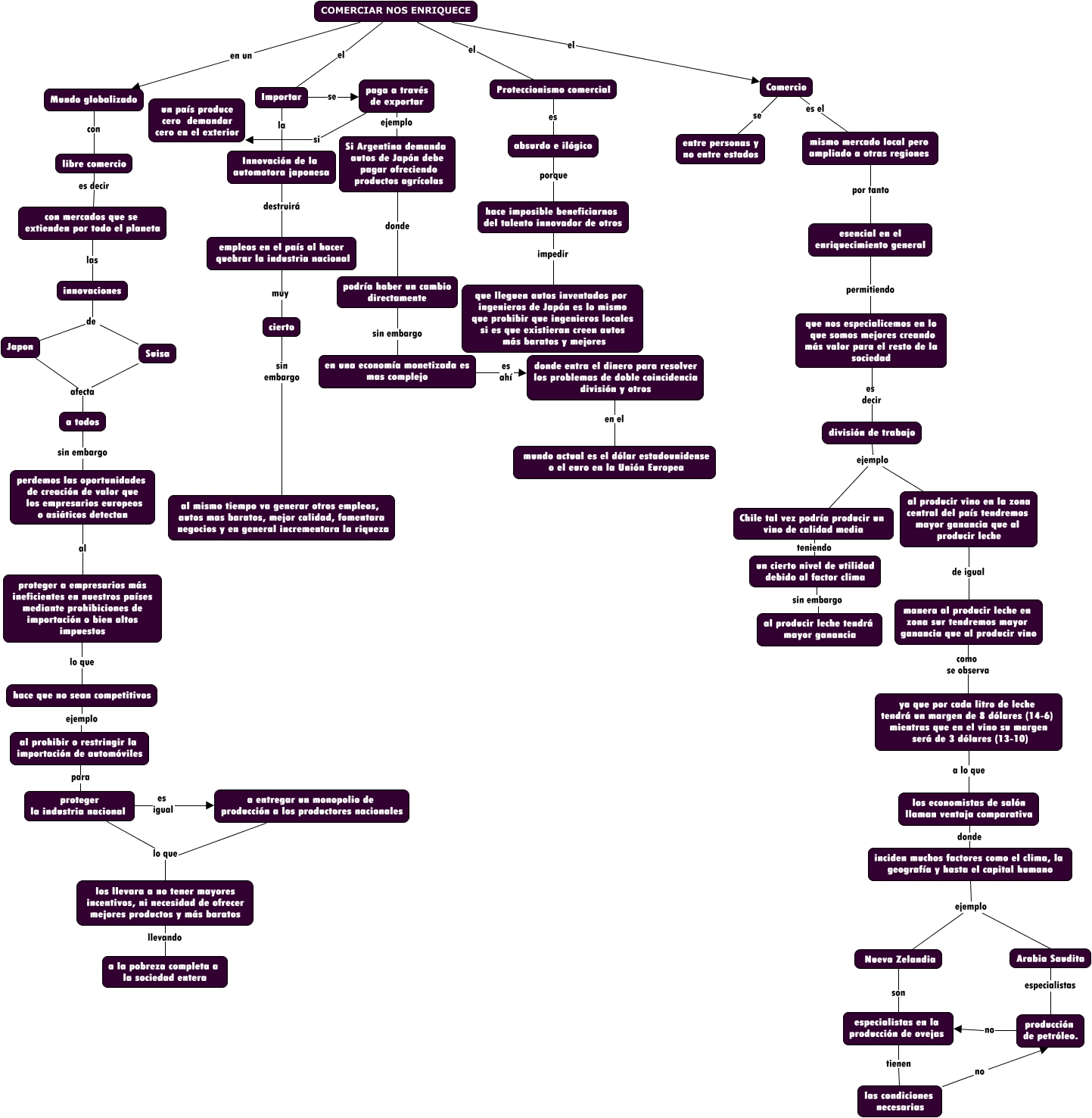 Este Cmap, tiene información relacionada con: PREGUNTAS DE ENFOQUE, división de trabajo ejemplo Chile tal vez podría producir un vino de calidad media, Importar se paga a través de exportar, a todos sin embargo perdemos las oportunidades de creación de valor que los empresarios europeos o asiáticos detectan, Nueva Zelandia son especialistas en la producción de ovejas, Proteccionismo comercial es absurdo e ilógico, Si Argentina demanda autos de Japón debe pagar ofreciendo productos agrícolas donde podría haber un cambio directamente, paga a través de exportar si un país produce cero demandar cero en el exterior, que nos especialicemos en lo que somos mejores creando más valor para el resto de la sociedad es decir división de trabajo, con mercados que se extienden por todo el planeta las innovaciones, Comercio se entre personas y no entre estados, a entregar un monopolio de producción a los productores nacionales lo que los llevara a no tener mayores incentivos, ni necesidad de ofrecer mejores productos y más baratos, especialistas en la producción de ovejas tienen las condiciones necesarias, Importar la Innovación de la automotora japonesa, ya que por cada litro de leche tendrá un margen de 8 dólares (14-6) mientras que en el vino su margen será de 3 dólares (13-10) a lo que los economistas de salón llaman ventaja comparativa, empleos en el país al hacer quebrar la industria nacional muy cierto, inciden muchos factores como el clima, la geografía y hasta el capital humano ejemplo Nueva Zelandia, al producir vino en la zona central del país tendremos mayor ganancia que al producir leche de igual manera al producir leche en zona sur tendremos mayor ganancia que al producir vino, producción de petróleo. no especialistas en la producción de ovejas, hace imposible beneficiarnos del talento innovador de otros impedir que lleguen autos inventados por ingenieros de Japón es lo mismo que prohibir que ingenieros locales si es que existieran creen autos más baratos y mejores, Chile tal vez podría producir un vino de calidad media teniendo un cierto nivel de utilidad debido al factor clima