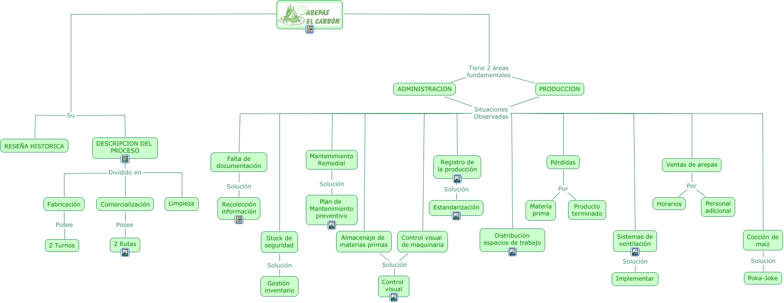 Este Cmap, tiene información relacionada con: AREPAS EL CARBON, ADMINISTRACION Situaciones Observadas Falta de documentación, Cocción de maíz Solución Poka-Joke, ADMINISTRACION Situaciones Observadas Distribución espacios de trabajo, DESCRIPCION DEL PROCESO Dividido en Fabricación, Sistemas de ventilación Solución Implementar, ADMINISTRACION Situaciones Observadas Stock de seguridad, ADMINISTRACION Situaciones Observadas Pérdidas, PRODUCCION Situaciones Observadas Registro de la producción, DESCRIPCION DEL PROCESO Dividido en Comercialización, Almacenaje de materias primas Solución Control visual, PRODUCCION Situaciones Observadas Cocción de maíz, PRODUCCION Situaciones Observadas Ventas de arepas, Pérdidas Por Producto terminado, Comercialización Posee 2 Rutas, ADMINISTRACION Situaciones Observadas Ventas de arepas, PRODUCCION Situaciones Observadas Stock de seguridad, Falta de documentación Solución Recolección información, Su RESEÑA HISTORICA, Tiene 2 áreas fundamentales PRODUCCION, PRODUCCION Situaciones Observadas Pérdidas