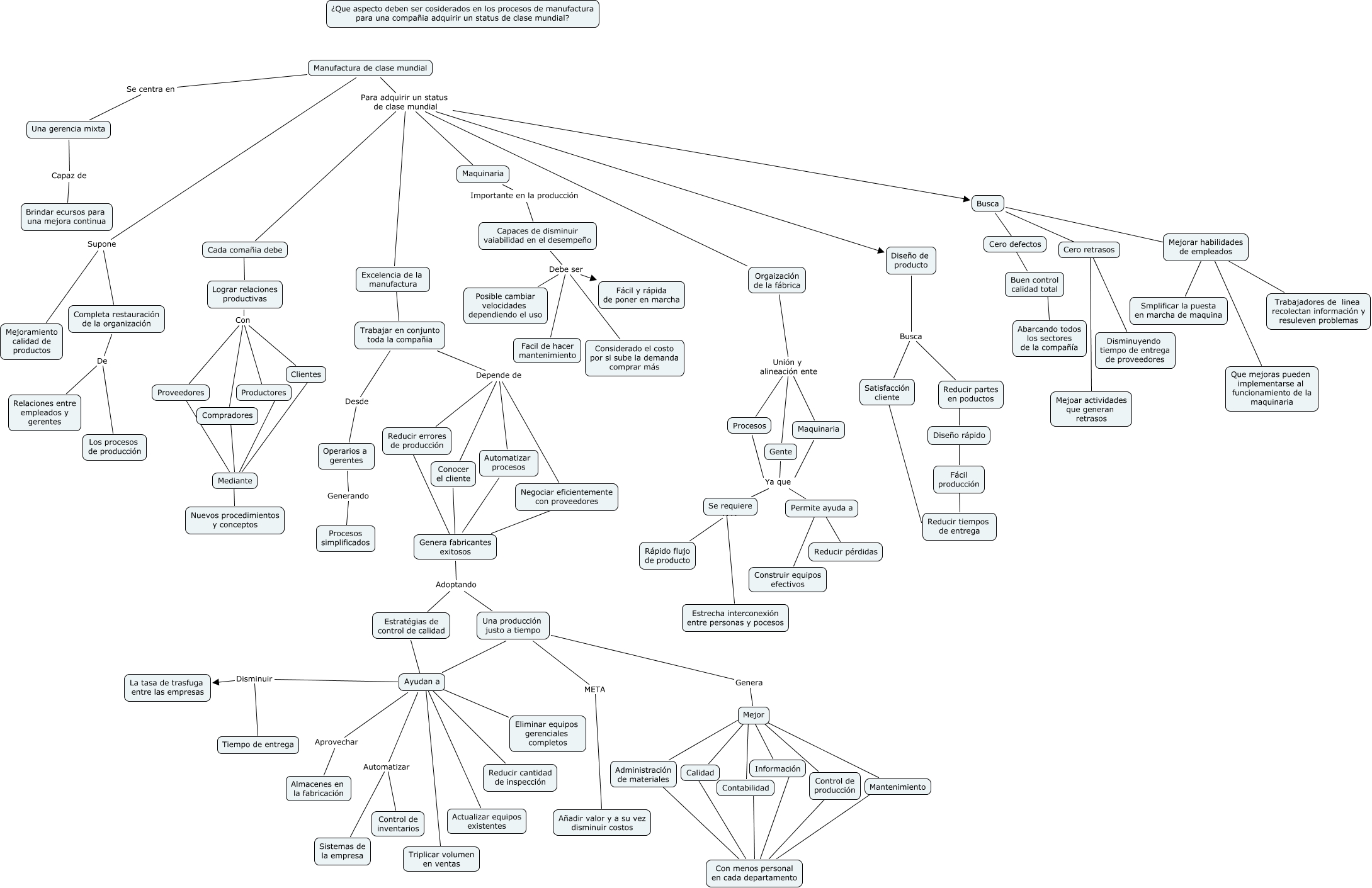 Este Cmap, tiene información relacionada con: Manufactura de clase mundial, Trabajar en conjunto toda la compañia Desde Operarios a gerentes, Automatizar procesos ???? Genera fabricantes exitosos, Ayudan a ???? Triplicar volumen en ventas, Compradores ???? Mediante, Manufactura de clase mundial Para adquirir un status de clase mundial Cada comañia debe, Busca ???? Cero defectos, Completa restauración de la organización De Relaciones entre empleados y gerentes, Manufactura de clase mundial Para adquirir un status de clase mundial Orgaización de la fábrica, Se requiere ???? Rápido flujo de producto, Diseño de producto Busca Reducir partes en poductos, Contabilidad ???? Con menos personal en cada departamento, Lograr relaciones productivas Con Compradores, Mejorar habilidades de empleados ???? Smplificar la puesta en marcha de maquina, Maquinaria Ya que Se requiere, Cero retrasos ???? Mejoar actividades que generan retrasos, Una producción justo a tiempo META Añadir valor y a su vez disminuir costos, Permite ayuda a ???? Construir equipos efectivos, Ayudan a Automatizar Sistemas de la empresa, Orgaización de la fábrica Unión y alineación ente Gente, Trabajar en conjunto toda la compañia Depende de Reducir errores de producción