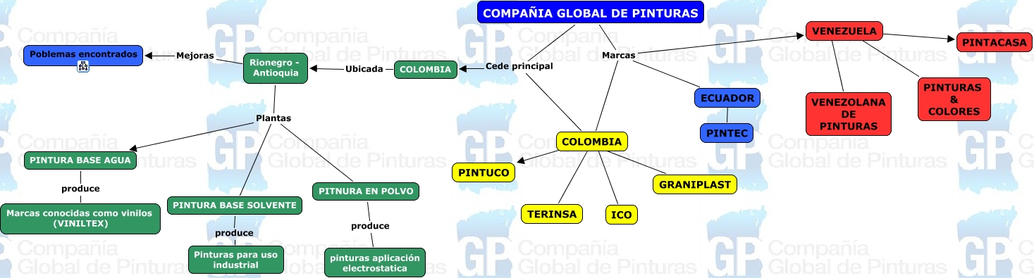 This Concept Map, created with IHMC CmapTools, has information related to: Global de Pinturas, VENEZUELA VENEZOLANA DE PINTURAS, COMPAÑIA GLOBAL DE PINTURAS Marcas COLOMBIA, COLOMBIA PINTUCO, COMPAÑIA GLOBAL DE PINTURAS Marcas VENEZUELA, COMPAÑIA GLOBAL DE PINTURAS Marcas ECUADOR, VENEZUELA ???? PINTACASA, COMPAÑIA GLOBAL DE PINTURAS Cede principal COLOMBIA, Rionegro - Antioquia Plantas PINTURA BASE SOLVENTE, Rionegro - Antioquia Plantas PITNURA EN POLVO, COMPAÑIA GLOBAL DE PINTURAS Cede principal COLOMBIA, Rionegro - Antioquia Plantas PINTURA BASE AGUA, COLOMBIA Ubicada Rionegro - Antioquia, VENEZUELA ???? PINTURAS & COLORES, COLOMBIA ???? TERINSA, PITNURA EN POLVO produce pinturas aplicación electrostatica, PINTURA BASE SOLVENTE produce Pinturas para uso industrial, ECUADOR ???? PINTEC, Rionegro - Antioquia Mejoras Poblemas encontrados, COLOMBIA ???? GRANIPLAST, COLOMBIA ???? ICO