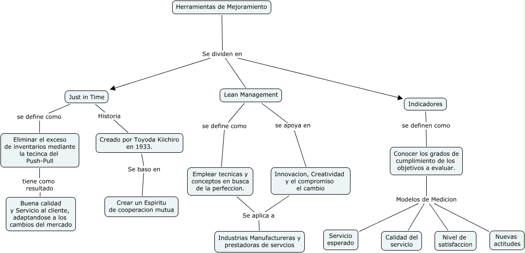 Este Cmap, tiene información relacionada con: Cmap Articulos Juan Esteban Llano, Conocer los grados de cumplimiento de los objetivos a evaluar. Modelos de Medicion Nivel de satisfaccion, Just in Time Historia Creado por Toyoda Kiichiro en 1933., Conocer los grados de cumplimiento de los objetivos a evaluar. Modelos de Medicion Nuevas actitudes, Indicadores se definen como Conocer los grados de cumplimiento de los objetivos a evaluar., Just in Time se define como Eliminar el exceso de inventarios mediante la tecinca del Push-Pull, Lean Management se define como Emplear tecnicas y conceptos en busca de la perfeccion., Emplear tecnicas y conceptos en busca de la perfeccion. Se aplica a Industrias Manufactureras y prestadoras de servcios, Creado por Toyoda Kiichiro en 1933. Se baso en Crear un Espiritu de cooperacion mutua, Herramientas de Mejoramiento Se dividen en Indicadores, Herramientas de Mejoramiento Se dividen en Just in Time, Lean Management se apoya en Innovacion, Creatividad y el compromiso el cambio, Conocer los grados de cumplimiento de los objetivos a evaluar. Modelos de Medicion Calidad del servicio, Innovacion, Creatividad y el compromiso el cambio Se aplica a Industrias Manufactureras y prestadoras de servcios, Herramientas de Mejoramiento Se dividen en Lean Management, Eliminar el exceso de inventarios mediante la tecinca del Push-Pull tiene como resultado Buena calidad y Servicio al cliente, adaptandose a los cambios del mercado, Conocer los grados de cumplimiento de los objetivos a evaluar. Modelos de Medicion Servicio esperado