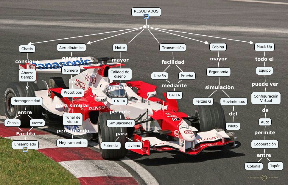 Este Cmap, tiene información relacionada con: Resultados, Diseño mediante CATIA, Motor mayor Calidad de diseño, Movimientos del Piloto, Homogeneidad entre Motor, Motor Facilita Ensamblado, Simulaciones para Liviano, Aerodinámica genera Número, Número de Prototipos, Mock Up todo el Equipo, Prueba mediante CATIA, Transmisión facilidad Diseño, Chasis consigue Ahorro tiempo, RESULTADOS en Chasis, Configuración Virtual de Auto, Homogeneidad entre Chasis, RESULTADOS en Cabina, Túnel de viento permitiendo Mejoramientos, Transmisión facilidad Prueba, Auto permite Cooperación, Ergonomía simulación Ferzas G