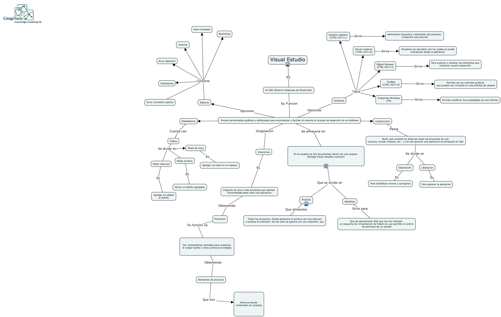 Este Cmap, tiene información relacionada con: actividad 3, Tolbox Se divide en Modo de trazo, Soluciones Es Conjunto de uno o mas proyectos que aportan funcionalidad para crear una aplicacion, Tolbox Se divide en Modo insercion, Elementos de proyecto Que son Archivos fuente contenidos en carpetas, Ventanas Opciones Provee herramientas graficas y sofisticadas para automatizar y facilitar al maximo el proceso de desarrollo de un software, Provee herramientas graficas y sofisticadas para automatizar y facilitar al maximo el proceso de desarrollo de un software Se almacena en En la carpeta de mis documentos dentro de una carpeta llamada Visual estudios (version), Diseñadores Cuenta con Tolbox, Editores Contiene Branching, Editores Contiene Error correction options, Depuracion Es Para identificar errores y corregirlos, Provee herramientas graficas y sofisticadas para automatizar y facilitar al maximo el proceso de desarrollo de un software ???? Diseñadores, Editores Contiene Auto-Complete, Object Browser (CTRL+ALT+J) Sirve Para explorar y analizar los elementos que compone nuestro desarrollo, Ventanas Tipos Properties Windows (F4), Properties Windows (F4) Sirve Permite modificar las propiedades de una interfaz, Ventanas Tipos Object Browser (CTRL+ALT+J), Visual Estudio ES Un IDE (Entorno Integrado de Desarrollo), Proyectos Su funcion es Ser contenedores utilizados para organizar el codigo fuente y otros archivos de trabajo., Modo arrastre Es Mover un diseño agregado, Un IDE (Entorno Integrado de Desarrollo) Su Funcion Provee herramientas graficas y sofisticadas para automatizar y facilitar al maximo el proceso de desarrollo de un software