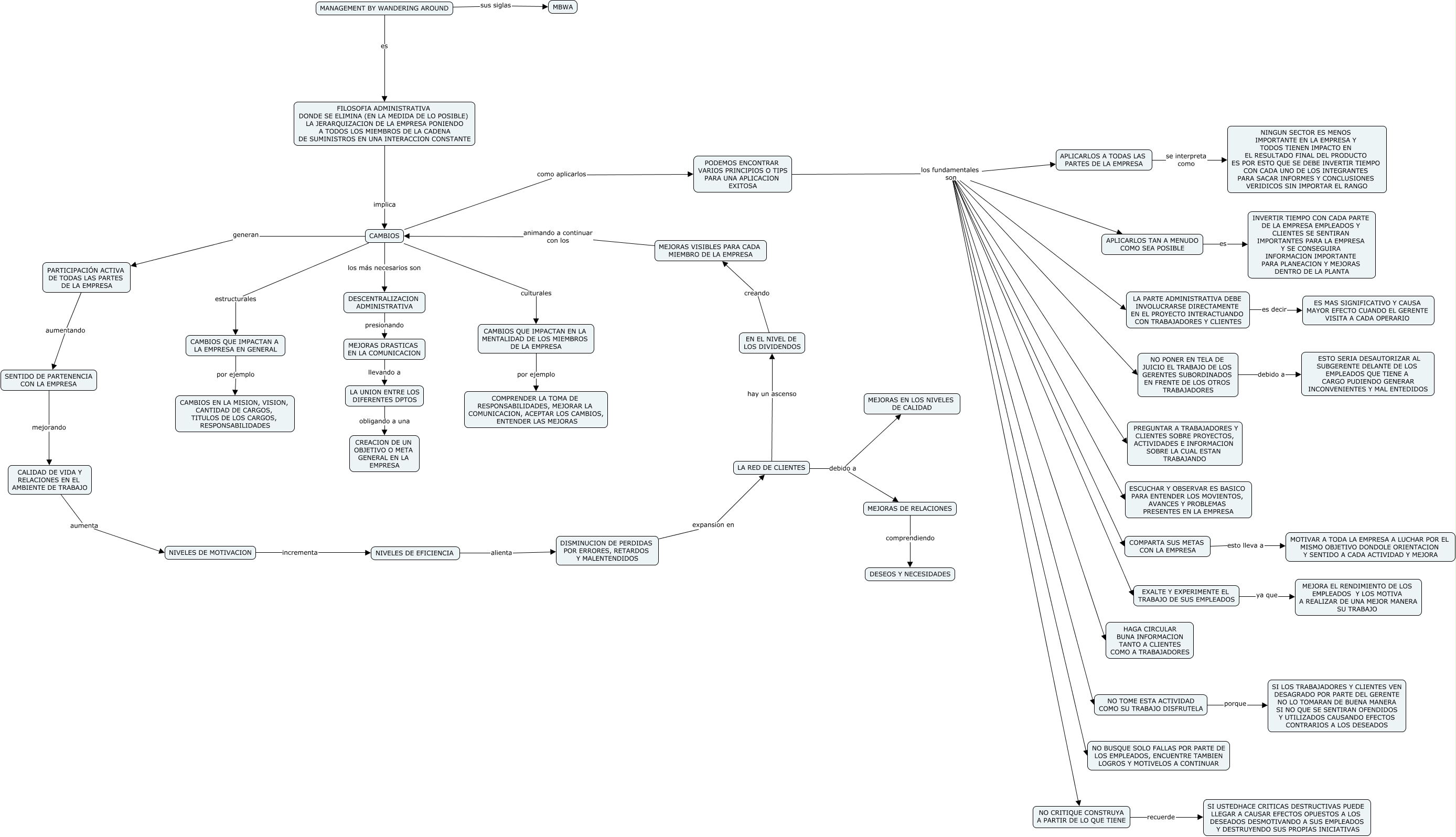 Este Cmap, tiene información relacionada con: MBWA, PODEMOS ENCONTRAR VARIOS PRINCIPIOS O TIPS PARA UNA APLICACION EXITOSA los fundamentales son NO TOME ESTA ACTIVIDAD COMO SU TRABAJO DISFRUTELA, PODEMOS ENCONTRAR VARIOS PRINCIPIOS O TIPS PARA UNA APLICACION EXITOSA los fundamentales son COMPARTA SUS METAS CON LA EMPRESA, PARTICIPACIÓN ACTIVA DE TODAS LAS PARTES DE LA EMPRESA aumentando SENTIDO DE PARTENENCIA CON LA EMPRESA, FILOSOFIA ADMINISTRATIVA DONDE SE ELIMINA (EN LA MEDIDA DE LO POSIBLE) LA JERARQUIZACION DE LA EMPRESA PONIENDO A TODOS LOS MIEMBROS DE LA CADENA DE SUMINISTROS EN UNA INTERACCION CONSTANTE implica CAMBIOS, DESCENTRALIZACION ADMINISTRATIVA presionando MEJORAS DRASTICAS EN LA COMUNICACION, NIVELES DE MOTIVACION incrementa NIVELES DE EFICIENCIA, PODEMOS ENCONTRAR VARIOS PRINCIPIOS O TIPS PARA UNA APLICACION EXITOSA los fundamentales son APLICARLOS A TODAS LAS PARTES DE LA EMPRESA, CAMBIOS los más necesarios son DESCENTRALIZACION ADMINISTRATIVA, CAMBIOS como aplicarlos PODEMOS ENCONTRAR VARIOS PRINCIPIOS O TIPS PARA UNA APLICACION EXITOSA, CAMBIOS generan PARTICIPACIÓN ACTIVA DE TODAS LAS PARTES DE LA EMPRESA, PODEMOS ENCONTRAR VARIOS PRINCIPIOS O TIPS PARA UNA APLICACION EXITOSA los fundamentales son NO PONER EN TELA DE JUICIO EL TRABAJO DE LOS GERENTES SUBORDINADOS EN FRENTE DE LOS OTROS TRABAJADORES, CALIDAD DE VIDA Y RELACIONES EN EL AMBIENTE DE TRABAJO aumenta NIVELES DE MOTIVACION, LA RED DE CLIENTES debido a MEJORAS DE RELACIONES, MEJORAS DRASTICAS EN LA COMUNICACION llevando a LA UNION ENTRE LOS DIFERENTES DPTOS, MANAGEMENT BY WANDERING AROUND es FILOSOFIA ADMINISTRATIVA DONDE SE ELIMINA (EN LA MEDIDA DE LO POSIBLE) LA JERARQUIZACION DE LA EMPRESA PONIENDO A TODOS LOS MIEMBROS DE LA CADENA DE SUMINISTROS EN UNA INTERACCION CONSTANTE, MANAGEMENT BY WANDERING AROUND sus siglas MBWA, LA RED DE CLIENTES hay un ascenso EN EL NIVEL DE LOS DIVIDENDOS, CAMBIOS estructurales CAMBIOS QUE IMPACTAN A LA EMPRESA EN GENERAL, APLICARLOS A TODAS LAS PARTES DE LA EMPRESA se interpreta como NINGUN SECTOR ES MENOS IMPORTANTE EN LA EMPRESA Y TODOS TIENEN IMPACTO EN EL RESULTADO FINAL DEL PRODUCTO ES POR ESTO QUE SE DEBE INVERTIR TIEMPO CON CADA UNO DE LOS INTEGRANTES PARA SACAR INFORMES Y CONCLUSIONES VERIDICOS SIN IMPORTAR EL RANGO, CAMBIOS culturales CAMBIOS QUE IMPACTAN EN LA MENTALIDAD DE LOS MIEMBROS DE LA EMPRESA
