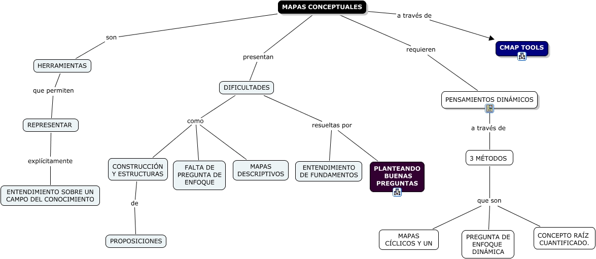 Este Cmap, tiene información relacionada con: MAPAS CONCEPTUALES, MAPAS CONCEPTUALES son HERRAMIENTAS, MAPAS CONCEPTUALES requieren PENSAMIENTOS DIN�?MICOS, 3 MÉTODOS que son PREGUNTA DE ENFOQUE DIN�?MICA, MAPAS CONCEPTUALES presentan DIFICULTADES, PENSAMIENTOS DIN�?MICOS a través de 3 MÉTODOS, DIFICULTADES como MAPAS DESCRIPTIVOS, CONSTRUCCIÓN Y ESTRUCTURAS de PROPOSICIONES, 3 MÉTODOS que son MAPAS C�?CLICOS Y UN, 3 MÉTODOS que son CONCEPTO RA�?Z CUANTIFICADO., DIFICULTADES resueltas por PLANTEANDO BUENAS PREGUNTAS, DIFICULTADES resueltas por ENTENDIMIENTO DE FUNDAMENTOS, MAPAS CONCEPTUALES a través de CMAP TOOLS, HERRAMIENTAS que permiten REPRESENTAR, REPRESENTAR explícitamente ENTENDIMIENTO SOBRE UN CAMPO DEL CONOCIMIENTO, DIFICULTADES como FALTA DE PREGUNTA DE ENFOQUE, DIFICULTADES como CONSTRUCCIÓN Y ESTRUCTURAS