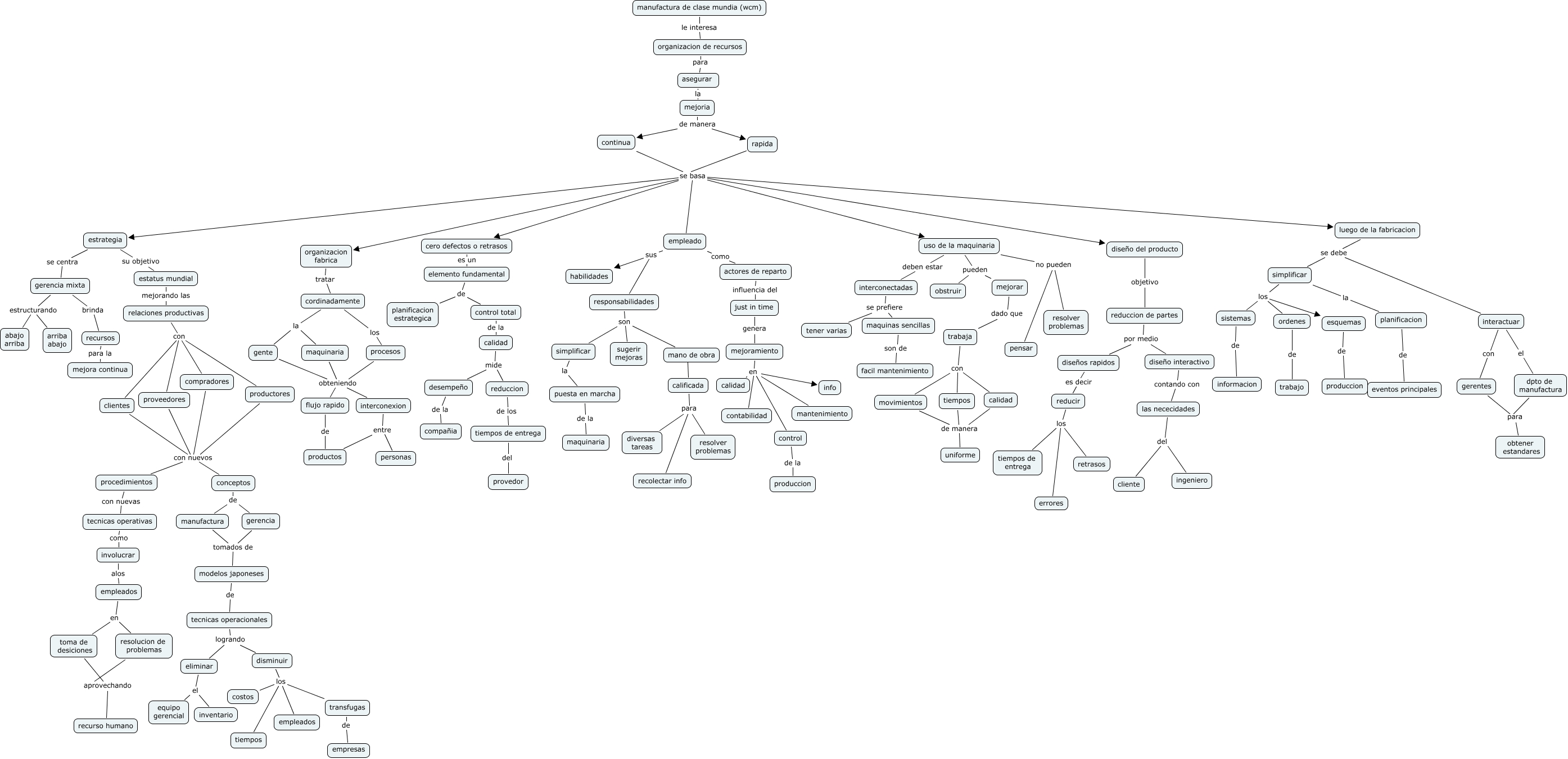 Este Cmap, tiene información relacionada con: manufactura de clase mundial, simplificar la planificacion, uso de la maquinaria no pueden resolver problemas, manufactura tomados de modelos japoneses, calidad mide reduccion, modelos japoneses de tecnicas operacionales, tecnicas operativas como involucrar, continua se basa empleado, maquinaria obteniendo flujo rapido, control de la produccion, mano de obra ???? calificada, productores con nuevos procedimientos, recursos para la mejora continua, interconectadas se prefiere maquinas sencillas, trabaja con tiempos, trabaja con movimientos, flujo rapido de productos, continua se basa organizacion fabrica, maquinaria obteniendo interconexion, diseño del producto objetivo reduccion de partes, estrategia su objetivo estatus mundial