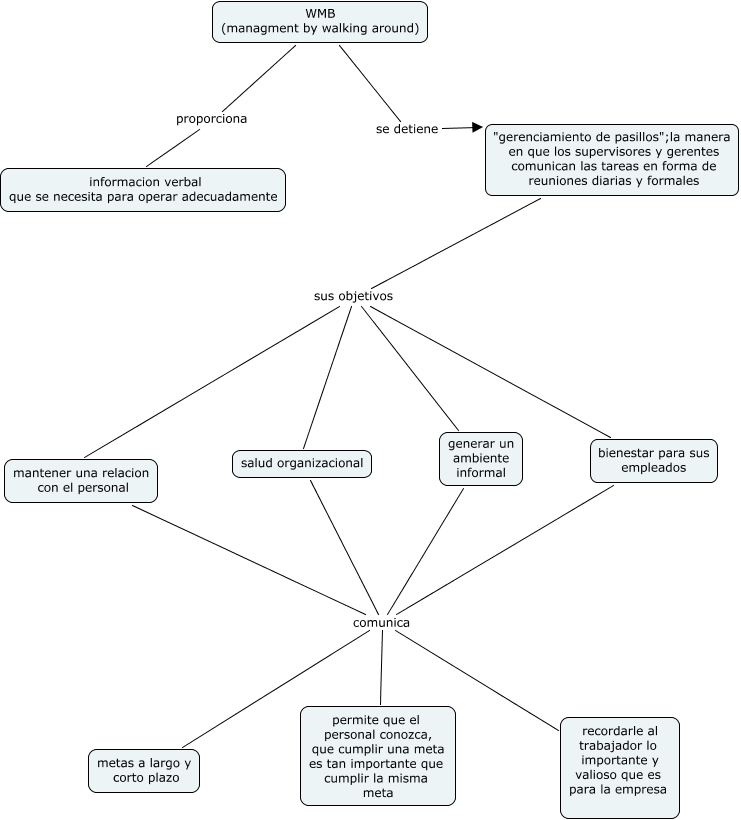 Este mapa conceptual tiene información relacionada a: mbwa, salud organizacional comunica metas a largo y corto plazo, salud organizacional comunica recordarle al trabajador lo importante y valioso que es para la empresa, mantener una relacion con el personal comunica metas a largo y corto plazo, bienestar para sus empleados comunica metas a largo y corto plazo, bienestar para sus empleados comunica recordarle al trabajador lo importante y valioso que es para la empresa, mantener una relacion con el personal comunica permite que el personal conozca, que cumplir una meta es tan importante que cumplir la misma meta, mantener una relacion con el personal comunica recordarle al trabajador lo importante y valioso que es para la empresa, generar un ambiente informal comunica recordarle al trabajador lo importante y valioso que es para la empresa, "gerenciamiento de pasillos";la manera en que los supervisores y gerentes comunican las tareas en forma de reuniones diarias y formales sus objetivos mantener una relacion con el personal, "gerenciamiento de pasillos";la manera en que los supervisores y gerentes comunican las tareas en forma de reuniones diarias y formales sus objetivos salud organizacional, "gerenciamiento de pasillos";la manera en que los supervisores y gerentes comunican las tareas en forma de reuniones diarias y formales sus objetivos bienestar para sus empleados, "gerenciamiento de pasillos";la manera en que los supervisores y gerentes comunican las tareas en forma de reuniones diarias y formales sus objetivos generar un ambiente informal, generar un ambiente informal comunica metas a largo y corto plazo, WMB (managment by walking around) se detiene "gerenciamiento de pasillos";la manera en que los supervisores y gerentes comunican las tareas en forma de reuniones diarias y formales, salud organizacional comunica permite que el personal conozca, que cumplir una meta es tan importante que cumplir la misma meta, bienestar para sus empleados comunica permite que el personal conozca, que cumplir una meta es tan importante que cumplir la misma meta, generar un ambiente informal comunica permite que el personal conozca, que cumplir una meta es tan importante que cumplir la misma meta, WMB (managment by walking around) proporciona informacion verbal que se necesita para operar adecuadamente