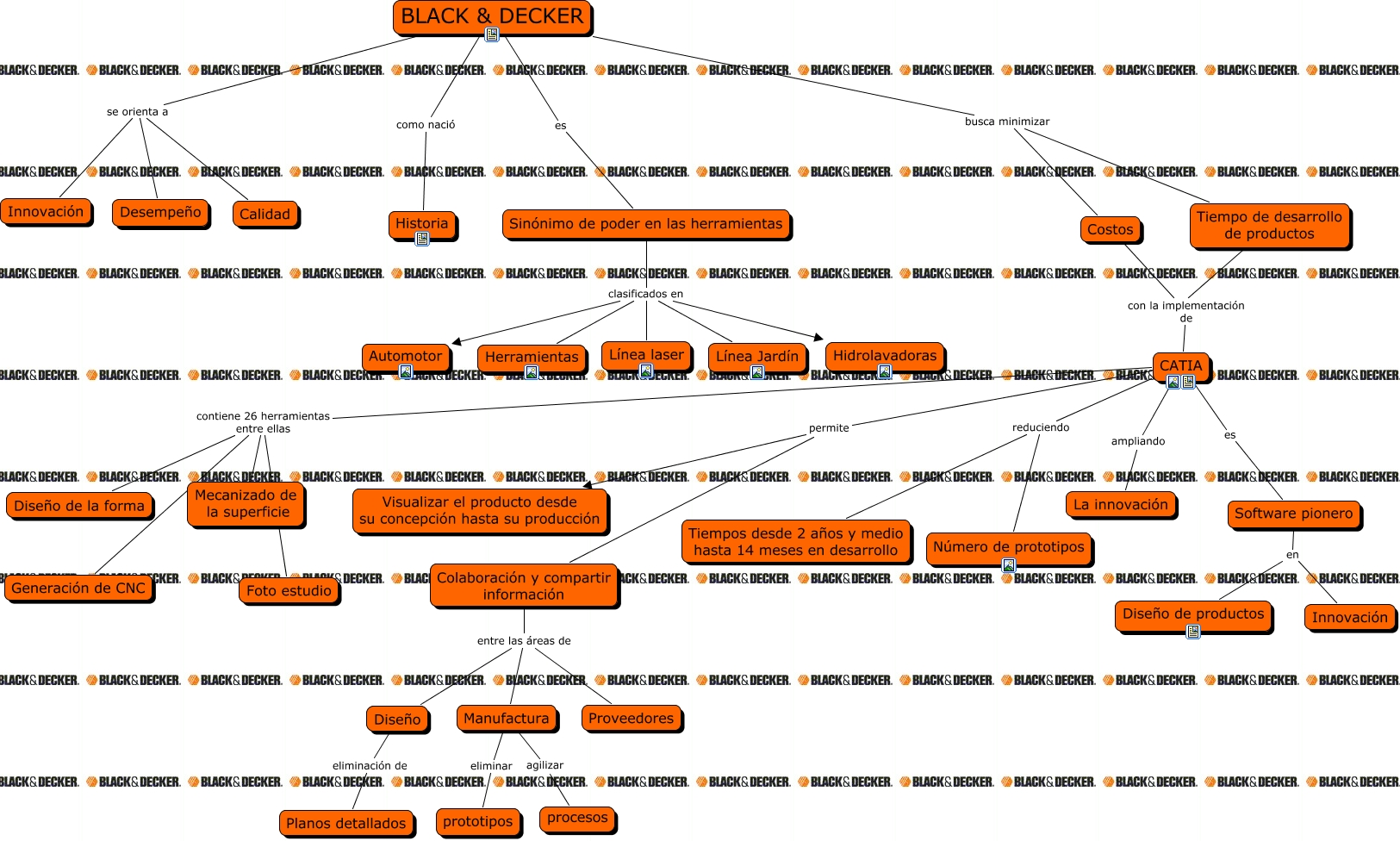 Este Cmap, tiene información relacionada con: Black & Decker, CATIA reduciendo Número de prototipos, CATIA es Software pionero, CATIA reduciendo Tiempos desde 2 años y medio hasta 14 meses en desarrollo, CATIA permite Visualizar el producto desde su concepción hasta su producción, Software pionero en Diseño de productos, CATIA permite Colaboración y compartir información, Colaboración y compartir información entre las áreas de Proveedores, BLACK & DECKER se orienta a Innovación, Diseño eliminación de Planos detallados, Costos con la implementación de CATIA, Sinónimo de poder en las herramientas clasificados en Hidrolavadoras, CATIA ampliando La innovación, Colaboración y compartir información entre las áreas de Manufactura, CATIA contiene 26 herramientas entre ellas Diseño de la forma, CATIA contiene 26 herramientas entre ellas Generación de CNC, Sinónimo de poder en las herramientas clasificados en Automotor, BLACK & DECKER es Sinónimo de poder en las herramientas, Colaboración y compartir información entre las áreas de Diseño, Tiempo de desarrollo de productos con la implementación de CATIA, Manufactura agilizar procesos