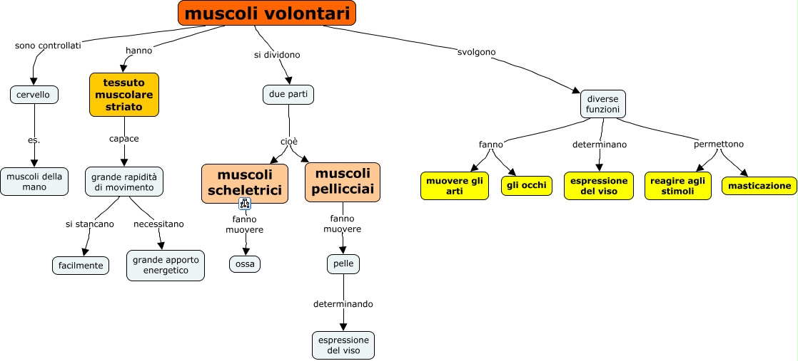 Questa Cmap, creata con IHMC CmapTools, contiene informazioni relative a: 13.03 muscoli volontari, muscoli volontari svolgono diverse funzioni, diverse funzioni determinano espressione del viso, due parti cioè muscoli scheletrici, tessuto muscolare striato capace grande rapidità di movimento, diverse funzioni fanno muovere gli arti, diverse funzioni permettono reagire agli stimoli, pelle determinando espressione del viso, diverse funzioni fanno gli occhi, due parti cioè muscoli pellicciai, muscoli volontari sono controllati cervello, muscoli volontari hanno tessuto muscolare striato, cervello es. muscoli della mano, grande rapidità di movimento si stancano facilmente, muscoli pellicciai fanno muovere pelle, diverse funzioni permettono masticazione, muscoli scheletrici fanno muovere ossa, muscoli volontari si dividono due parti, grande rapidità di movimento necessitano grande apporto energetico