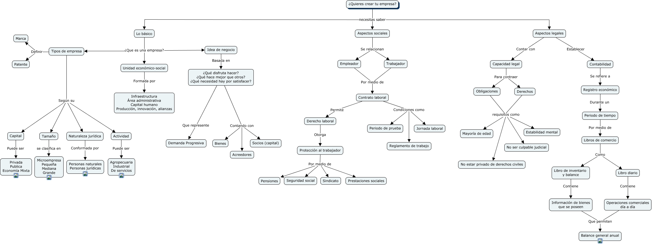 Este Cmap, tiene información relacionada con: Conceptos vistos, Derechos requisitos como No ser culpable judicial, ¿Quieres crear tu empresa? necesitas saber Aspectos legales, Libros de comercio Como Libro de inventario y balance, Obligaciones requisitos como No estar privado de derechos civiles, Obligaciones requisitos como No ser culpable judicial, Capacidad legal Para contraer Obligaciones, Libro diario Contiene Operaciones comerciales día a día, Aspectos sociales Se relacionan Empleador, Registro económico Durante un Periodo de tiempo, Empleador Por medio de Contrato laboral, Contrato laboral Condiciones como Jornada laboral, Obligaciones requisitos como Estabilidad mental, Derechos requisitos como Estabilidad mental, Contrato laboral Condiciones como Periodo de prueba, Información de bienes que se poseen Que permiten Balance general anual, Derecho laboral Otorga Protección al trabajador, Naturaleza jurídica Conformada por Personas naturales Personas jurídicas, ¿Qué disfruta hacer? ¿Qué hace mejor que otros? ¿Qué necesidad hay por satisfacer? Contando con Bienes, Actividad Puede ser Agropecuaria Industrial De servicios, Operaciones comerciales día a día Que permiten Balance general anual