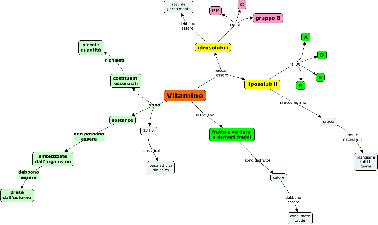 Questa Cmap, creata con IHMC CmapTools, contiene informazioni relative a: 14.10 Vitamine, idrosolubili come C, calore debbono essere consumate crude, liposolubili come D, frutta e verdura e derivati freddi sono distrutte calore, liposolubili come E, sostanze non possono essere sintetizzate dall'organismo, Vitamine sono costituenti essenziali, liposolubili si accumulano grassi, Vitamine possono essere idrosolubili, Vitamine possono essere liposolubili, liposolubili come A, liposolubili come K, Vitamine sono sostanze, sintetizzate dall'organismo debbono essere prese dall'esterno, idrosolubili debbono essere assunte giornalmente, costituenti essenziali richiesti piccole quantità, idrosolubili come gruppo B, Vitamine sono 13 tipi, grassi non è necessario mangiarle tutti i giorni, Vitamine si trovano frutta e verdura e derivati freddi