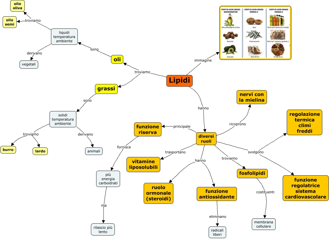 Questa Cmap, creata con IHMC CmapTools, contiene informazioni relative a: 14.07 Lipidi, più energia carboidrati ma rilascio più lento, Lipidi troviamo grassi, diversi ruoli svolgono funzione regolatrice sistema cardiovascolare, liquidi temperatura ambiente troviamo olio oliva, solidi temperatura ambiente derivano animali, diversi ruoli troviamo fosfolipidi, grassi sono solidi temperatura ambiente, diversi ruoli svolgono regolazione termica climi freddi, diversi ruoli principale funzione riserva, Lipidi hanno diversi ruoli, Lipidi troviamo oli, funzione antiossidante eliminano radicali liberi, diversi ruoli trasportano vitamine liposolubili, fosfolipidi costituenti membrana cellulare, solidi temperatura ambiente troviamo lardo, liquidi temperatura ambiente derivano vegetali, diversi ruoli ricoprono nervi con la mielina, liquidi temperatura ambiente troviamo olio semi, diversi ruoli hanno ruolo ormonale (steroidi), oli sono liquidi temperatura ambiente