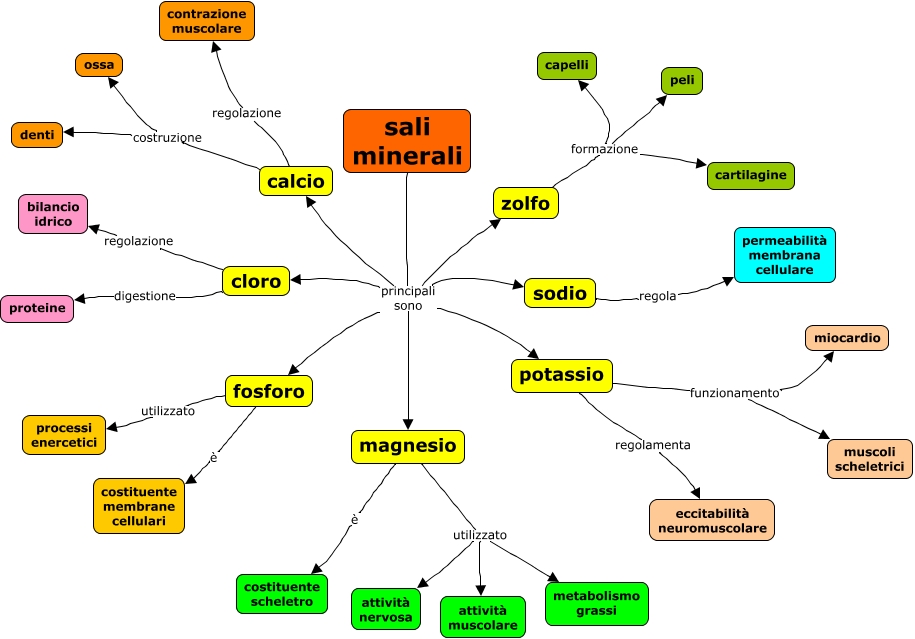 Questa Cmap, creata con IHMC CmapTools, contiene informazioni relative a: 14.12 Sali Minerali, sali minerali principali sono fosforo, calcio costruzione ossa, fosforo utilizzato processi enercetici, sali minerali principali sono zolfo, calcio costruzione denti, sodio regola permeabilità membrana cellulare, zolfo formazione capelli, magnesio utilizzato attività muscolare, fosforo è costituente membrane cellulari, potassio regolamenta eccitabilità neuromuscolare, sali minerali principali sono sodio, magnesio utilizzato metabolismo grassi, magnesio utilizzato attività nervosa, sali minerali principali sono potassio, zolfo formazione cartilagine, sali minerali principali sono magnesio, zolfo formazione peli, cloro regolazione bilancio idrico, magnesio è costituente scheletro, potassio funzionamento miocardio