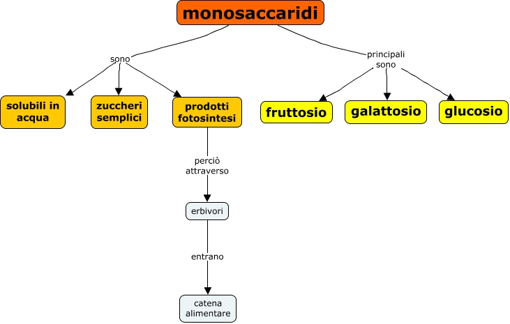 Questa Cmap, creata con IHMC CmapTools, contiene informazioni relative a: 14.03 monosaccaridi, monosaccaridi sono zuccheri semplici, monosaccaridi sono solubili in acqua, erbivori entrano catena alimentare, monosaccaridi principali sono glucosio, monosaccaridi principali sono galattosio, prodotti fotosintesi perciò attraverso erbivori, monosaccaridi principali sono fruttosio, monosaccaridi sono prodotti fotosintesi