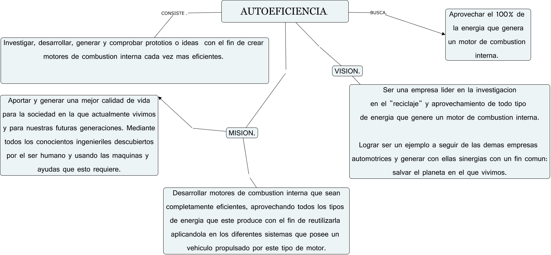 Este Cmap, tiene información relacionada con: Autoeficiencia, MISION. Aportar y generar una mejor calidad de vida para la sociedad en la que actualmente vivimos y para nuestras futuras generaciones. Mediante todos los conocientos ingenieriles descubiertos por el ser humano y usando las maquinas y ayudas que esto requiere., VISION. Ser una empresa lider en la investigacion en el "reciclaje" y aprovechamiento de todo tipo de energia que genere un motor de combustion interna. Lograr ser un ejemplo a seguir de las demas empresas automotrices y generar con ellas sinergias con un fin comun: salvar el planeta en el que vivimos., MISION. Desarrollar motores de combustion interna que sean completamente eficientes, aprovechando todos los tipos de energia que este produce con el fin de reutilizarla aplicandola en los diferentes sistemas que posee un vehiculo propulsado por este tipo de motor., AUTOEFICIENCIA. VISION., AUTOEFICIENCIA. MISION., AUTOEFICIENCIA. CONSISTE . Investigar, desarrollar, generar y comprobar prototios o ideas con el fin de crear motores de combustion interna cada vez mas eficientes., AUTOEFICIENCIA. BUSCA. Aprovechar el 100% de la energia que genera un motor de combustion interna.