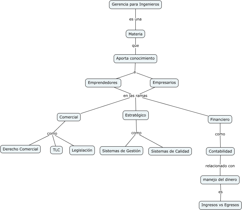 Este Cmap, tiene información relacionada con: Gerencia Andres, Empresarios en las ramas Comercial, Empresarios en las ramas Financiero, Comercial como Legislación, Financiero como Contabilidad, Emprendedores en las ramas Financiero, Emprendedores en las ramas Comercial, Estratégico como Sistemas de Calidad, Aporta conocimiento a Emprendedores, Gerencia para Ingenieros es una Materia, Empresarios en las ramas Estratégico, Contabilidad relacionado con manejo del dinero, manejo del dinero es Ingresos vs Egresos, Comercial como TLC, Estratégico como Sistemas de Gestión, Emprendedores en las ramas Estratégico, Aporta conocimiento a Empresarios, Comercial como Derecho Comercial, Materia que Aporta conocimiento