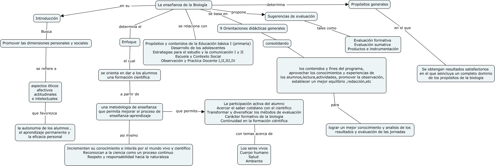 Este Cmap, tiene información relacionada con: la enseñanza de la biologia, una metodologia de enseñanza que permita mejorar el proceso de enseñanza-aprendizaje que permite La participación activa del alumno Acercar el saber cotidiano con el cientifico Transformar y diversificar los métodos de evaluación Carácter formativo de la biologia Continuidad en la formación ciéntifica, Enfoque el cual se orienta en dar a los alumnos una formación científica, aspectos éticos afectivos actitudinales e intelectuales que favorezca la autonomia de los alumnos , el aprendizaje permanente y la eficacia personal, Propósitos generales en el que Se obtengan resultados satisfactorios en el que seincluya un completo dominio de los propósitos de la biologia, La enseñanza de la Biología se basa en 9 Orientaciones didácticas generales, La enseñanza de la Biología se relaciona con Propósitos y contenidos de la Educación básica I (primaria) Desarrollo de los adolescentes Estrategias para el estudio y la comunicación I y II Escuela y Contexto Social Observación y Practica Docente I,II,III,IV, una metodologia de enseñanza que permita mejorar el proceso de enseñanza-aprendizaje asi mismo Incrementen su conocimiento e interés por el mundo vivo y cientifico Reconozcan a la ciencia como un proceso continuo Respeto y responsabilidad hacia la naturaleza, Introducción Busca Promover las dimensiones personales y sociales, 9 Orientaciones didácticas generales los contenidos y fines del programa, aprovechar los conocimientos y experiencias de los alumnos,lectura,actividades, promover la observación, establecer un mejor equilibrio ,redacción,etc, Sugerencias de evaluación tales como Evaluación formativa Evaluación sumativa Productos e instrumentación, La enseñanza de la Biología en su Introducción, se orienta en dar a los alumnos una formación científica a partir de una metodologia de enseñanza que permita mejorar el proceso de enseñanza-aprendizaje, los contenidos y fines del programa, aprovechar los conocimientos y experiencias de los alumnos,lectura,actividades, promover la observación, establecer un mejor equilibrio ,redacción,etc para lograr un mejor conocimiento y analisis de los resultados y evaluación de las jornadas, La enseñanza de la Biología determina Propósitos generales, Promover las dimensiones personales y sociales se refiere a aspectos éticos afectivos actitudinales e intelectuales, La enseñanza de la Biología determina el Enfoque, La participación activa del alumno Acercar el saber cotidiano con el cientifico Transformar y diversificar los métodos de evaluación Carácter formativo de la biologia Continuidad en la formación ciéntifica con temas acerca de Los seres vivos Cuerpo humano Salud Ambiente, La enseñanza de la Biología propone Sugerencias de evaluación