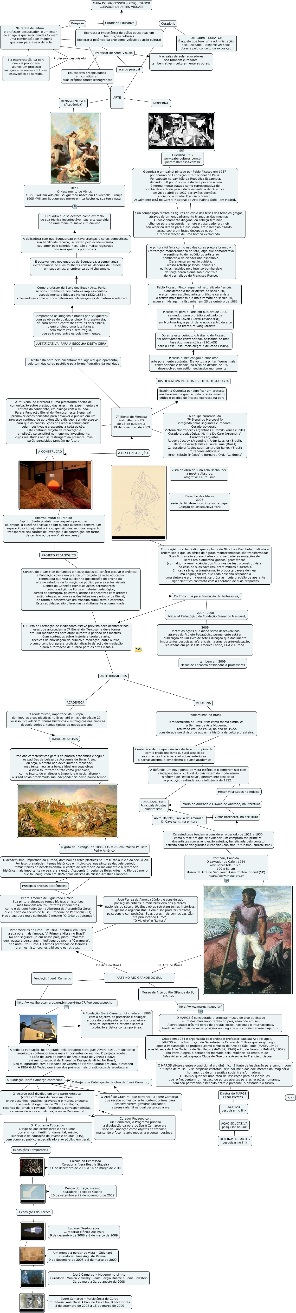 Esse mapa conceitual, produzido no IHMC CmapTools, tem a informação relacionada a: Mapa Professor - pesquisador -curador PARA HACERRRR, Victor Brecheret, na escultura IDEALIZADORES Principais Artistas Modernistas, O MARGS situa-se entre o tradicional e o dinâmico. É fonte de inspiração para cumprir com a função de museu.Visa propiciar contatos, seja por meio dos documentos do imaginário humano, ou de uma prática social transformadora. O MARGS quer ser uma casa de inspiração para os indivíduos que o freqüentam, um espaço de portas abertas para as relações humanas, com seu patrimônio estendido entre o presente, o passado e o futuro. ???? Diretor do MARGS Cézar Prestes, ???? Lugares Desdobrados Curadoria: Mônica Zielinsky 9 de dezembro de 2008 a 8 de março de 2009, ARTE ???? RENASCENTISTA (Acadêmica), Curadoria ???? ARTE, Durante este período, o trabalho de Picasso foi relativamente convencional, passando de uma Fase Azul melancólica (1901-05) para a Fase Rosa, mais alegre e delicada (1905). ???? Picasso nunca chegou a criar uma arte puramente abstrata. Ele voltou a pintar figuras mais convencionais e depois, no nício da década de 1920, desenvolveu um estilo neoclássico monumental., Curadoria ???? ARTE, A DESCONSTRUÇÃO ????, Os estudiosos tendem a considerar o período de 1922 a 1930, como a fase em que se evidencia um compromisso primeiro dos artistas com a renovação estética, beneficiada pelo contato estreito com as vanguardas européias (cubismo, futurismo, surrealismo) ???? Portinari, Candido O Lavrador de Café , 1934 óleo sobre tela, c.s.d. 100 x 81 cm Museu de Arte de São Paulo Assis Chateaubriand (SP) http://www.masp.art.br, Uma das características gerais da pintura acadêmica é seguir os padrões de beleza da Academia de Belas Artes, ou seja, o artista não deve imitar a realidade, mas tentar recriar a beleza ideal em suas obras. A idéia foi retratar o fato como grandioso, com o intuito de enaltecer o Império e o nacionalismo - o Brasil havia proclamado sua independência havia pouco tempo. ????, O MARGS é considerado o principal museu de arte do Estado e um dos mais importantes do país, reunindo em seu Acervo quase três mil obras de artistas locais, nacionais e internacionais, tendo sediado mais de mil exposições ao longo de sua cinqüentenária trajetória. ???? Criada em 1954 e organizada pelo artista e professor paulista Ado Malagoli, o MARGS é uma Instituição da Secretaria de Estado da Cultura que surgiu logo após a implantação de projetos ,como o Museu de Arte de São Paulo (MASP, 1947) e os Museus de Arte Moderna de São Paulo (MAM-SP, 1948) e Rio de Janeiro (MAM-RJ, 1952). Em Porto Alegre, o período foi marcado pela influência do Instituto de Belas Artes e pelos grupos Clube de Gravura e Associação Francisco Lisboa., ???? Exposições do Acervo, ARTE BRASILEIRA ???? ACADÊMICA, A CONSTRUÇÃO ????, Anita Malfatti, Tarcila do Amaral e Di Cavalcanti, na pintura ???? Victor Brecheret, na escultura, ARTE NO RIO GRANDE DO SUL Da Arte no Brasil Vitor Meireles de Lima: Em 1861, produziu em Paris a sua obra mais famosa, "A Primeira Missa no Brasil". No ano seguinte, já em nosso país, pintou "Moema", que retrata a personagem indígena do poema "Caramuru", de Santa Rita Durão. Os temas preferidos de Meireles eram os históricos, os bíblicos e os retratos., Construído a partir de demandas e necessidades do cenário escolar e artístico, a Fundação coloca em prática um projeto de ação educativa continuada que visa auxiliar na qualificação do ensino da arte no estado e na formação de público para as artes visuais. Dentro da Conexão Bienal as ações permanentes – como a edição de livros e material pedagógico, cursos de formação, palestras, oficinas e encontros com artistas - estão integradas com as ações feitas nos períodos de Bienal, de forma a desenvolver um trabalho cumulativo e coerente. Estas atividades são oferecidas gratuitamente à comunidade. ???? Os Encontros para Formação de Professores,, ???? Iberê Camargo – Persistência do Corpo Curadoria: Ana Maria Albani de Carvalho, Blanca Brites 3 de setembro de 2008 a 15 de março de 2009, ????, Mário de Andrade e Oswald de Andrade, na literatura ???? Victor Brecheret, na escultura