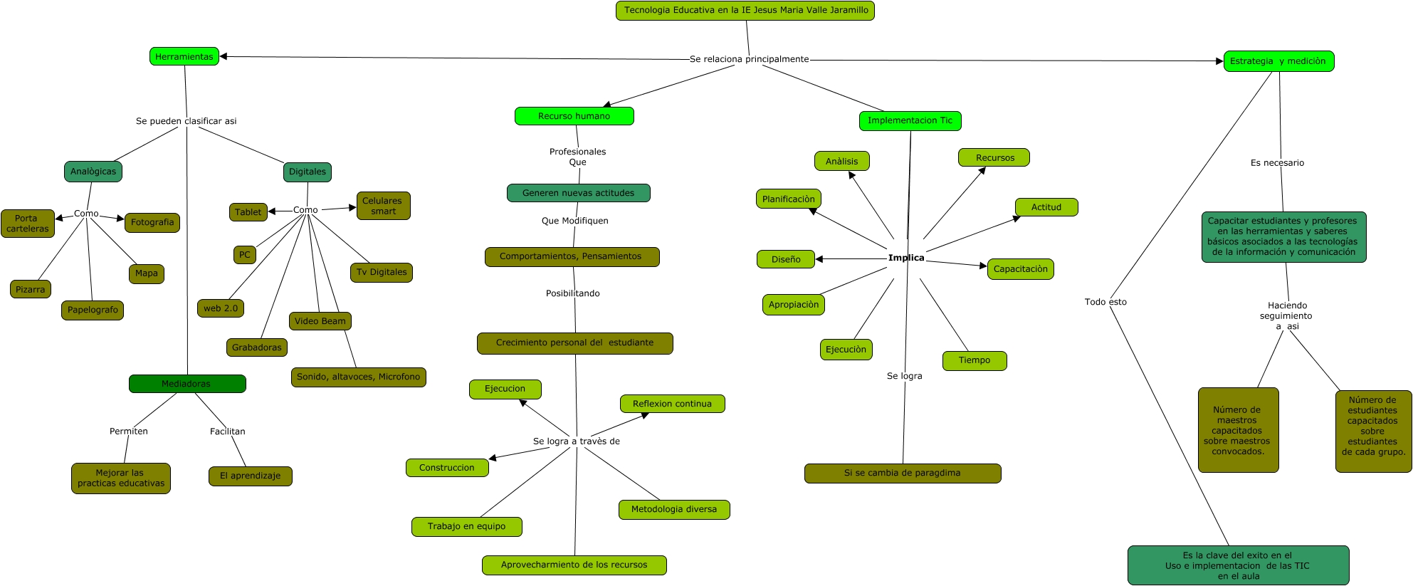 Este Cmap, tiene información relacionada con: USO DE LAS TIC EN IE JMVJ, Herramientas Se pueden clasificar asi Analògicas, Capacitar estudiantes y profesores en las herramientas y saberes básicos asociados a las tecnologías de la información y comunicación Haciendo seguimiento a asi Número de estudiantes capacitados sobre estudiantes de cada grupo., Mediadoras Permiten Mejorar las practicas educativas, Implementacion Tic Implica Capacitaciòn, Analògicas Como Papelografo, Mediadoras Facilitan El aprendizaje, Analògicas Como Pizarra, Implementacion Tic Implica Planificaciòn, Implementacion Tic Se logra Si se cambia de paragdima, Digitales Como Celulares smart, Recurso humano Profesionales Que Generen nuevas actitudes, Crecimiento personal del estudiante Se logra a travès de Construccion, Digitales Como Grabadoras, Implementacion Tic Implica Recursos, Generen nuevas actitudes Que Modifiquen Comportamientos, Pensamientos, Tecnologia Educativa en la IE Jesus Maria Valle Jaramillo Se relaciona principalmente Herramientas, Estrategia y mediciòn Todo esto Es la clave del exito en el Uso e implementacion de las TIC en el aula, Comportamientos, Pensamientos Posibilitando Crecimiento personal del estudiante, Implementacion Tic Implica Tiempo, Crecimiento personal del estudiante Se logra a travès de Aprovecharmiento de los recursos