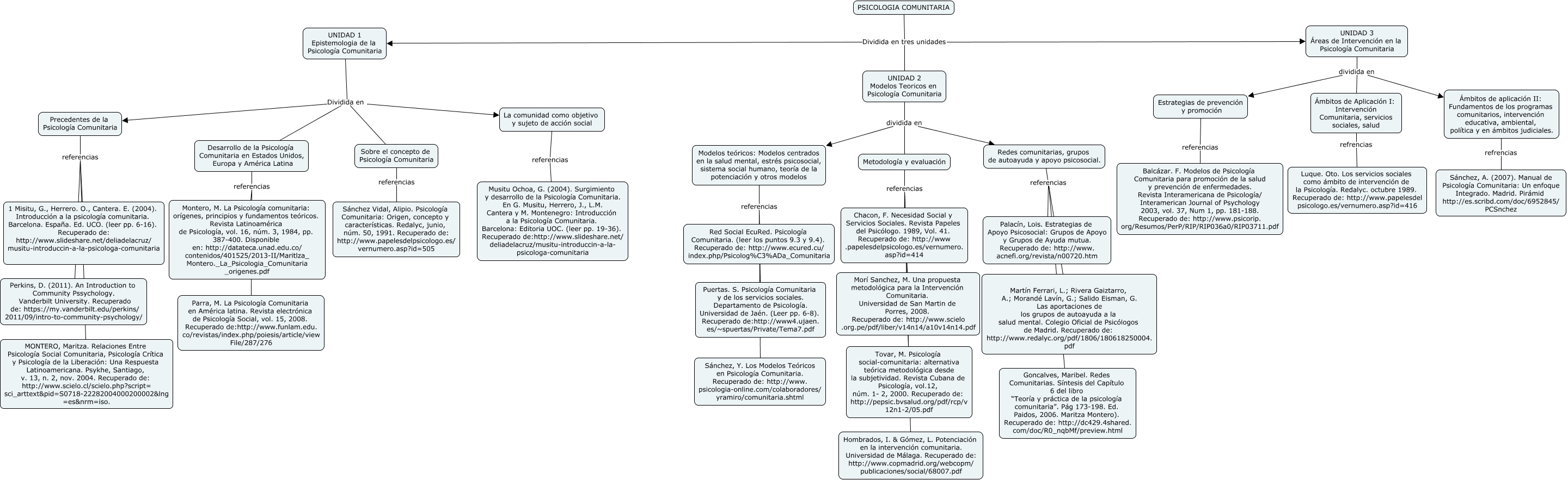 Este Cmap, tiene información relacionada con: unidades, PSICOLOGIA COMUNITARIA Dividida en tres unidades UNIDAD 1 Epistemologia de la Psicología Comunitaria, Desarrollo de la Psicología Comunitaria en Estados Unidos, Europa y América Latina referencias Montero, M. La Psicología comunitaria: orígenes, principios y fundamentos teóricos. Revista Latinoamérica de Psicología, vol. 16, núm. 3, 1984, pp. 387-400. Disponible en: http://datateca.unad.edu.co/ contenidos/401525/2013-II/Maritlza_ Montero._La_Psicologia_Comunitaria _origenes.pdf, UNIDAD 1 Epistemologia de la Psicología Comunitaria Dividida en Desarrollo de la Psicología Comunitaria en Estados Unidos, Europa y América Latina, Redes comunitarias, grupos de autoayuda y apoyo psicosocial. referencias Martín Ferrari, L.; Rivera Gaiztarro, A.; Morandé Lavín, G.; Salido Eisman, G. Las aportaciones de los grupos de autoayuda a la salud mental. Colegio Oficial de Psicólogos de Madrid. Recuperado de: http://www.redalyc.org/pdf/1806/180618250004. pdf, UNIDAD 3 Áreas de Intervención en la Psicología Comunitaria dividida en Ámbitos de Aplicación I: Intervención Comunitaria, servicios sociales, salud, Modelos teóricos: Modelos centrados en la salud mental, estrés psicosocial, sistema social humano, teoría de la potenciación y otros modelos referencias Puertas. S. Psicología Comunitaria y de los servicios sociales. Departamento de Psicología. Universidad de Jaén. (Leer pp. 6-8). Recuperado de:http://www4.ujaen. es/~spuertas/Private/Tema7.pdf, UNIDAD 1 Epistemologia de la Psicología Comunitaria Dividida en Precedentes de la Psicología Comunitaria, PSICOLOGIA COMUNITARIA Dividida en tres unidades UNIDAD 3 Áreas de Intervención en la Psicología Comunitaria, Metodología y evaluación referencias Hombrados, I. & Gómez, L. Potenciación en la intervención comunitaria. Universidad de Málaga. Recuperado de: http://www.copmadrid.org/webcopm/ publicaciones/social/68007.pdf, Redes comunitarias, grupos de autoayuda y apoyo psicosocial. referencias Palacín, Lois. Estrategias de Apoyo Psicosocial: Grupos de Apoyo y Grupos de Ayuda mutua. Recuperado de: http://www. acnefi.org/revista/n00720.htm, Precedentes de la Psicología Comunitaria referencias Perkins, D. (2011). An Introduction to Community Pssychology. Vanderbilt University. Recuperado de: https://my.vanderbilt.edu/perkins/ 2011/09/intro-to-community-psychology/, Estrategias de prevención y promoción referencias Balcázar. F. Modelos de Psicología Comunitaria para promoción de la salud y prevención de enfermedades. Revista Interamericana de Psicología/ Interamerican Journal of Psychology 2003, vol. 37, Num 1, pp. 181-188. Recuperado de: http://www.psicorip. org/Resumos/PerP/RIP/RIP036a0/RIP03711.pdf, La comunidad como objetivo y sujeto de acción social referencias Musitu Ochoa, G. (2004). Surgimiento y desarrollo de la Psicología Comunitaria. En G. Musitu, Herrero, J., L.M. Cantera y M. Montenegro: Introducción a la Psicología Comunitaria. Barcelona: Editoria UOC. (leer pp. 19-36). Recuperado de:http://www.slideshare.net/ deliadelacruz/musitu-introduccin-a-la- psicologa-comunitaria, Metodología y evaluación referencias Morí Sanchez, M. Una propuesta metodológica para la Intervención Comunitaria. Universidad de San Martin de Porres, 2008. Recuperado de: http://www.scielo .org.pe/pdf/liber/v14n14/a10v14n14.pdf, Metodología y evaluación referencias Chacon, F. Necesidad Social y Servicios Sociales. Revista Papeles del Psicólogo. 1989, Vol. 41. Recuperado de: http://www .papelesdelpsicologo.es/vernumero. asp?id=414, Precedentes de la Psicología Comunitaria referencias 1 Misitu, G., Herrero. O., Cantera. E. (2004). Introducción a la psicología comunitaria. Barcelona. España. Ed. UCO. (leer pp. 6-16). Recuperado de: http://www.slideshare.net/deliadelacruz/ musitu-introduccin-a-la-psicologa-comunitaria, Ámbitos de Aplicación I: Intervención Comunitaria, servicios sociales, salud refrencias Luque. Oto. Los servicios sociales como ámbito de intervención de la Psicología. Redalyc. octubre 1989. Recuperado de: http://www.papelesdel psicologo.es/vernumero.asp?id=416, Modelos teóricos: Modelos centrados en la salud mental, estrés psicosocial, sistema social humano, teoría de la potenciación y otros modelos referencias Red Social EcuRed. Psicología Comunitaria. (leer los puntos 9.3 y 9.4). Recuperado de: http://www.ecured.cu/ index.php/Psicolog%C3%ADa_Comunitaria, UNIDAD 2 Modelos Teoricos en Psicología Comunitaria dividida en Redes comunitarias, grupos de autoayuda y apoyo psicosocial., UNIDAD 3 Áreas de Intervención en la Psicología Comunitaria dividida en Estrategias de prevención y promoción