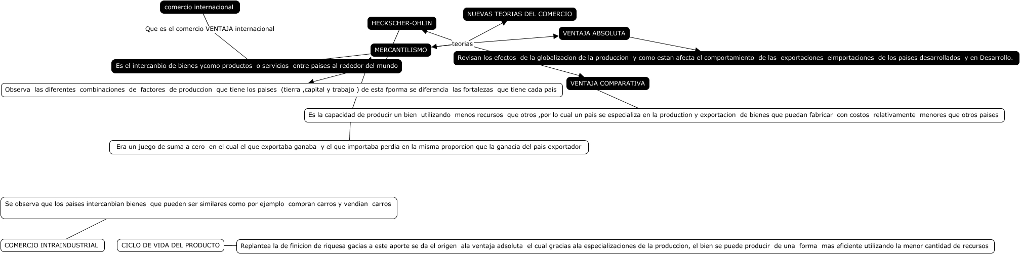 Este Cmap, tiene información relacionada con: mapa_mental, Es el intercanbio de bienes ycomo productos o servicios entre paises al rededor del mundo teorias VENTAJA COMPARATIVA, Era un juego de suma a cero en el cual el que exportaba ganaba y el que importaba perdia en la misma proporcion que la ganacia del pais exportador ???? MERCANTILISMO, VENTAJA ABSOLUTA ???? Revisan los efectos de la globalizacion de la produccion y como estan afecta el comportamiento de las exportaciones eimportaciones de los paises desarrollados y en Desarrollo., COMERCIO INTRAINDUSTRIAL ???? Se observa que los paises intercanbian bienes que pueden ser similares como por ejemplo compran carros y vendian carros, VENTAJA COMPARATIVA ???? Es la capacidad de producir un bien utilizando menos recursos que otros ,por lo cual un pais se especializa en la production y exportacion de bienes que puedan fabricar con costos relativamente menores que otros paises, CICLO DE VIDA DEL PRODUCTO ???? Replantea la de finicion de riquesa gacias a este aporte se da el origen ala ventaja adsoluta el cual gracias ala especializaciones de la produccion, el bien se puede producir de una forma mas eficiente utilizando la menor cantidad de recursos, Es el intercanbio de bienes ycomo productos o servicios entre paises al rededor del mundo teorias MERCANTILISMO, Es el intercanbio de bienes ycomo productos o servicios entre paises al rededor del mundo teorias NUEVAS TEORIAS DEL COMERCIO, Es el intercanbio de bienes ycomo productos o servicios entre paises al rededor del mundo teorias VENTAJA ABSOLUTA, HECKSCHER-OHLIN ???? Observa las diferentes combinaciones de factores de produccion que tiene los paises (tierra ,capital y trabajo ) de esta fporma se diferencia las fortalezas que tiene cada pais, Es el intercanbio de bienes ycomo productos o servicios entre paises al rededor del mundo teorias HECKSCHER-OHLIN, comercio internacional Que es el comercio VENTAJA internacional Es el intercanbio de bienes ycomo productos o servicios entre paises al rededor del mundo