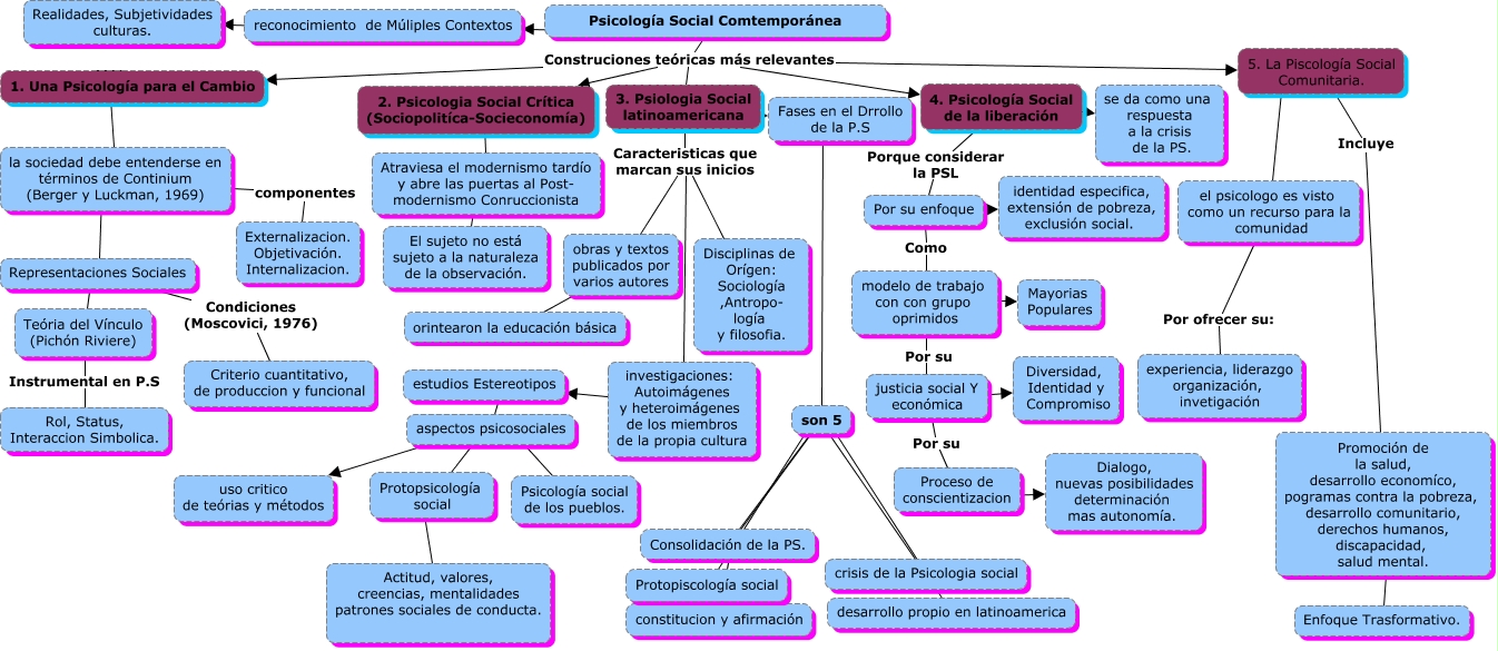 Este Cmap, tiene información relacionada con: Psicología Social Comtemporánea, 4. Psicología Social de la liberación Porque considerar la PSL Por su enfoque, obras y textos publicados por varios autores ???? orintearon la educación básica, justicia social Y económica ???? Diversidad, Identidad y Compromiso, aspectos psicosociales ???? Psicología social de los pueblos., 5. La Piscología Social Comunitaria. Incluye Promoción de la salud, desarrollo economíco, pogramas contra la pobreza, desarrollo comunitario, derechos humanos, discapacidad, salud mental., Psicología Social Comtemporánea Construciones teóricas más relevantes 2. Psicologia Social Crítica (Sociopolitíca-Socieconomía), Psicología Social Comtemporánea Construciones teóricas más relevantes 3. Psiologia Social latinoamericana, 5. La Piscología Social Comunitaria. ???? el psicologo es visto como un recurso para la comunidad, Por su enfoque ???? identidad especifica, extensión de pobreza, exclusión social., aspectos psicosociales ???? uso critico de teórias y métodos, 4. Psicología Social de la liberación ???? se da como una respuesta a la crisis de la PS., Fases en el Drrollo de la P.S ???? son 5, modelo de trabajo con con grupo oprimidos Por su justicia social Y económica, Representaciones Sociales Condiciones (Moscovici, 1976) Criterio cuantitativo, de produccion y funcional, Teória del Vínculo (Pichón Riviere) Instrumental en P.S Rol, Status, Interaccion Simbolica., 3. Psiologia Social latinoamericana ???? Fases en el Drrollo de la P.S, 3. Psiologia Social latinoamericana Caracteristicas que marcan sus inicios investigaciones: Autoimágenes y heteroimágenes de los miembros de la propia cultura, son 5 ???? crisis de la Psicologia social, investigaciones: Autoimágenes y heteroimágenes de los miembros de la propia cultura ???? estudios Estereotipos, Psicología Social Comtemporánea Construciones teóricas más relevantes 1. Una Psicología para el Cambio