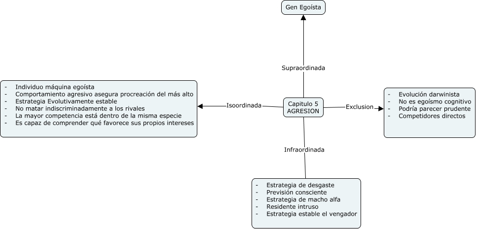 Este Cmap, tiene información relacionada con: agresion, Capitulo 5 AGRESION Exclusion - Evolución darwinista - No es egoísmo cognitivo - Podría parecer prudente - Competidores directos, Capitulo 5 AGRESION Supraordinada Gen Egoísta, Capitulo 5 AGRESION Infraordinada - Estrategia de desgaste - Previsión consciente - Estrategia de macho alfa - Residente intruso - Estrategia estable el vengador, Capitulo 5 AGRESION Isoordinada - Individuo máquina egoísta - Comportamiento agresivo asegura procreación del más alto - Estrategia Evolutivamente estable - No matar indiscriminadamente a los rivales - La mayor competencia está dentro de la misma especie - Es capaz de comprender qué favorece sus propios intereses, Capitulo 5 AGRESION Supraordinada Gen Egoísta