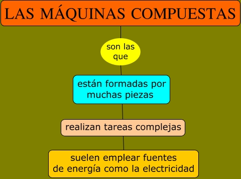 Este Cmap, tiene información relacionada con: Las máquinas compuestas, están formadas por muchas piezas realizan tareas complejas, realizan tareas complejas suelen emplear fuentes de energía como la electricidad, LAS MÁQUINAS COMPUESTAS son las que están formadas por muchas piezas