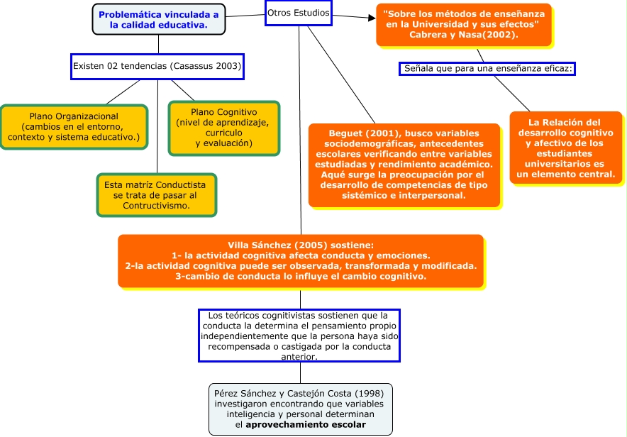 Este Cmap, tiene información relacionada con: Problemática de la calidad educativa 2do, Problemática vinculada a la calidad educativa. Existen 02 tendencias (Casassus 2003) Esta matríz Conductista se trata de pasar al Contructivismo., Problemática vinculada a la calidad educativa. Existen 02 tendencias (Casassus 2003) Plano Cognitivo (nivel de aprendizaje, curriculo y evaluación), Problemática vinculada a la calidad educativa. Otros Estudios "Sobre los métodos de enseñanza en la Universidad y sus efectos" Cabrera y Nasa(2002)., Problemática vinculada a la calidad educativa. Existen 02 tendencias (Casassus 2003) Plano Organizacional (cambios en el entorno, contexto y sistema educativo.), Problemática vinculada a la calidad educativa. Otros Estudios Beguet (2001), busco variables sociodemográficas, antecedentes escolares verificando entre variables estudiadas y rendimiento académico. Aqué surge la preocupación por el desarrollo de competencias de tipo sistémico e interpersonal., Villa Sánchez (2005) sostiene: 1- la actividad cognitiva afecta conducta y emociones. 2-la actividad cognitiva puede ser observada, transformada y modificada. 3-cambio de conducta lo influye el cambio cognitivo. Los teóricos cognitivistas sostienen que la conducta la determina el pensamiento propio independientemente que la persona haya sido recompensada o castigada por la conducta anterior. Pérez Sánchez y Castejón Costa (1998) investigaron encontrando que variables inteligencia y personal determinan el aprovechamiento escolar, "Sobre los métodos de enseñanza en la Universidad y sus efectos" Cabrera y Nasa(2002). Señala que para una enseñanza eficaz: La Relación del desarrollo cognitivo y afectivo de los estudiantes universitarios es un elemento central., Problemática vinculada a la calidad educativa. Otros Estudios Villa Sánchez (2005) sostiene: 1- la actividad cognitiva afecta conducta y emociones. 2-la actividad cognitiva puede ser observada, transformada y modificada. 3-cambio de conducta lo influye el cambio cognitivo.