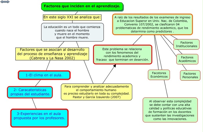 Este Cmap, tiene información relacionada con: Factores que inciden en el aprendizaje, Factores que inciden en el aprendizaje. En este siglo XXI se analiza que: La educación es un todo que comienza cuando nace el hombre y muere en el momento que el hombre muere., La educación es un todo que comienza cuando nace el hombre y muere en el momento que el hombre muere. Para comprender y analizar adecuadamente el comportamiento humano es preciso estudiarlo en toda su complejidad. Pastor y García Izauierdo (2007) Este problema se relaciona con los fenomenos del rendimiento academico y fracaso que terminan en deserción., La educación es un todo que comienza cuando nace el hombre y muere en el momento que el hombre muere. Factores que se asocian al desarrollo del proceso de enseñanza y aprendizaje (Cabrera y La Nasa 2002) 1-El clima en el aula., Este problema se relaciona con los fenomenos del rendimiento academico y fracaso que terminan en deserción. A raíz de los resultados de los examenes de ingreso a Educacion Superor en Univ. Nac. de Colombia, Convenio 107/2002, se clasficaron 04 problematicas de rendimiento academico, que los determina como predictores . Factores Personales, Este problema se relaciona con los fenomenos del rendimiento academico y fracaso que terminan en deserción. A raíz de los resultados de los examenes de ingreso a Educacion Superor en Univ. Nac. de Colombia, Convenio 107/2002, se clasficaron 04 problematicas de rendimiento academico, que los determina como predictores . Al observar esta complejidad se debe contar con una alta calidad y políticas educativas de formación en los docentes que sustenten las investigaciones como las innovaciones., Este problema se relaciona con los fenomenos del rendimiento academico y fracaso que terminan en deserción. A raíz de los resultados de los examenes de ingreso a Educacion Superor en Univ. Nac. de Colombia, Convenio 107/2002, se clasficaron 04 problematicas de rendimiento academico, que los determina como predictores . Facotores Económicos, 1-El clima en el aula. 2- Caracateristicas propias del estudiante. 3-Experiencias en el aula propuesta por los profesores., Este problema se relaciona con los fenomenos del rendimiento academico y fracaso que terminan en deserción. A raíz de los resultados de los examenes de ingreso a Educacion Superor en Univ. Nac. de Colombia, Convenio 107/2002, se clasficaron 04 problematicas de rendimiento academico, que los determina como predictores . Factores Académicos, Este problema se relaciona con los fenomenos del rendimiento academico y fracaso que terminan en deserción. A raíz de los resultados de los examenes de ingreso a Educacion Superor en Univ. Nac. de Colombia, Convenio 107/2002, se clasficaron 04 problematicas de rendimiento academico, que los determina como predictores . Factores Institucionales