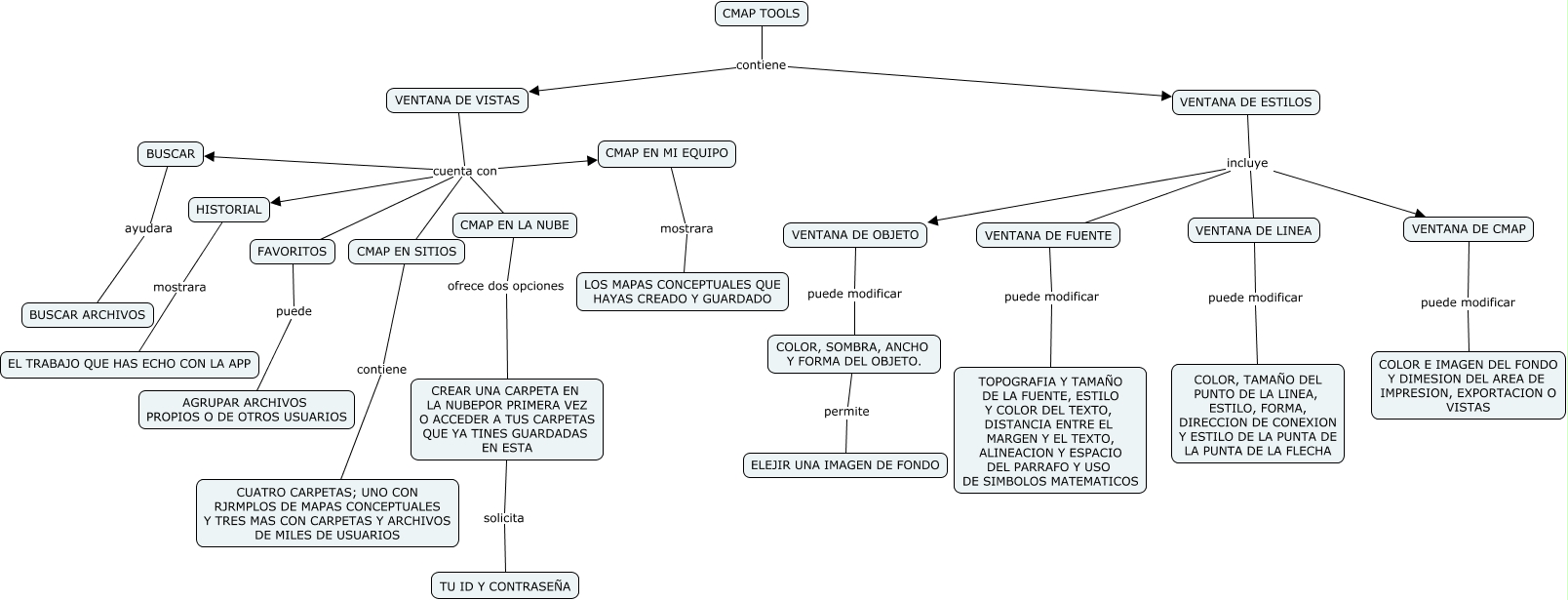 Este Cmap, tiene información relacionada con: 222EVELIN, VENTANA DE VISTAS cuenta con HISTORIAL, FAVORITOS puede AGRUPAR ARCHIVOS PROPIOS O DE OTROS USUARIOS, CMAP EN SITIOS contiene CUATRO CARPETAS; UNO CON RJRMPLOS DE MAPAS CONCEPTUALES Y TRES MAS CON CARPETAS Y ARCHIVOS DE MILES DE USUARIOS, VENTANA DE VISTAS cuenta con CMAP EN MI EQUIPO, VENTANA DE LINEA puede modificar COLOR, TAMAÑO DEL PUNTO DE LA LINEA, ESTILO, FORMA, DIRECCION DE CONEXION Y ESTILO DE LA PUNTA DE LA PUNTA DE LA FLECHA, CMAP EN MI EQUIPO mostrara LOS MAPAS CONCEPTUALES QUE HAYAS CREADO Y GUARDADO, VENTANA DE VISTAS cuenta con FAVORITOS, VENTANA DE VISTAS cuenta con CMAP EN LA NUBE, VENTANA DE OBJETO puede modificar COLOR, SOMBRA, ANCHO Y FORMA DEL OBJETO., VENTANA DE ESTILOS incluye VENTANA DE LINEA, COLOR, SOMBRA, ANCHO Y FORMA DEL OBJETO. permite ELEJIR UNA IMAGEN DE FONDO, HISTORIAL mostrara EL TRABAJO QUE HAS ECHO CON LA APP, CMAP TOOLS contiene VENTANA DE VISTAS, VENTANA DE FUENTE puede modificar TOPOGRAFIA Y TAMAÑO DE LA FUENTE, ESTILO Y COLOR DEL TEXTO, DISTANCIA ENTRE EL MARGEN Y EL TEXTO, ALINEACION Y ESPACIO DEL PARRAFO Y USO DE SIMBOLOS MATEMATICOS, VENTANA DE ESTILOS incluye VENTANA DE CMAP, BUSCAR ayudara BUSCAR ARCHIVOS, VENTANA DE VISTAS cuenta con CMAP EN SITIOS, VENTANA DE VISTAS cuenta con BUSCAR, CREAR UNA CARPETA EN LA NUBEPOR PRIMERA VEZ O ACCEDER A TUS CARPETAS QUE YA TINES GUARDADAS EN ESTA solicita TU ID Y CONTRASEÑA, VENTANA DE ESTILOS incluye VENTANA DE OBJETO