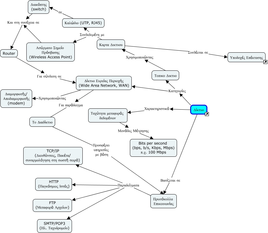 This Concept Map, created with IHMC CmapTools, has information related to: networks, Δίκτυο Βασίζεται σε Πρωτόκολλα Επικοινωνίας, Δίκτυο Ευρείας Περιοχής (Wide Area Network, WAN) Για παράδειγμα, Καρτα Δικτυου Συνδέεται σε Υποδοχές Επέκτασης, Πρωτόκολλα Επικοινωνίας Παραδείγματα HTTP (Παγκόσμιος Ιστός), Πρωτόκολλα Επικοινωνίας Παραδείγματα SMTP/POP3 (Ηλ. Ταχυδρομείο), Καρτα Δικτυου Συνδεδεμένη με Καλώδιο (UTP, RJ45), Δίκτυο Κατηγορίες Τοπικο Δικτυο, Καλώδιο (UTP, RJ45) σε Διακόπτης (switch), Το Διαδίκτυο Προσφέρει υπηρεσίες με βάση Πρωτόκολλα Επικοινωνίας, Διακόπτης (switch) Και στη συνέχεια σε Router, Ασύρματο Σημείο Πρόσβασης (Wireless Access Point) Και στη συνέχεια σε Router, Πρωτόκολλα Επικοινωνίας Παραδείγματα TCP/IP (Διευθύνσεις, Πακέτα/ συναρμολόγηση στη σωστή σειρά), Ταχύτητα μεταφοράς δεδομένων Μονάδες Μέτρησης Bits per second (bps, b/s, Kbps, Mbps) π.χ. 100 Mbps, Πρωτόκολλα Επικοινωνίας Παραδείγματα FTP (Μεταφορά Αρχείων), Δίκτυο Κατηγορίες Δίκτυο Ευρείας Περιοχής (Wide Area Network, WAN), Δίκτυο Ευρείας Περιοχής (Wide Area Network, WAN) Χρησιμοποιώντας Διαμορφωτής/ Αποδιαμορφωτής (modem), Καρτα Δικτυου Συνδεδεμένη με Ασύρματο Σημείο Πρόσβασης (Wireless Access Point), Δίκτυο Χαρακτηριστικά Ταχύτητα μεταφοράς δεδομένων, Router Για σύνδεση σε Δίκτυο Ευρείας Περιοχής (Wide Area Network, WAN), Τοπικο Δικτυο Χρησιμοποιώντας Καρτα Δικτυου