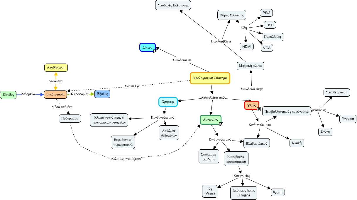 This Concept Map, created with IHMC CmapTools, has information related to: main, Χρήστης Κυνδυνεύει από Απώλεια δεδομένων, Υπολογιστικό Σύστημα Αποτελείται από Υλικό, Χρήστης Κυνδυνεύει από Κλοπή ταυτότητας ή προσωπικών στοιχείων, Υπολογιστικό Σύστημα Σκοπό έχει Επεξεργασία, Επεξεργασία Μέσα από ένα Πρόγραμμα, Χρήστης Κυνδυνεύει από Εκφοβιστική συμπεριφορά, Λογισμικό Κινδυνεύει από Σφάλματα Χρήστη, Μητρική κάρτα Περιλαμβάνει Θύρες Σύνδεσης, Υλικό Κινδυνεύει από Περιβαλλοντικούς παράγοντες, Περιβαλλοντικούς παράγοντες Κατηγορίες Υπερθέρμανση, Θύρες Σύνδεσης Είδη HDMI, Υλικό Κινδυνεύει από Κλοπή, Κακόβουλα προγράμματα Κατηγορίες Δπύρειος Ίππος (Trojan), Υπολογιστικό Σύστημα Συνδέεται σε Δίκτυο, Κακόβουλα προγράμματα Κατηγορίες Worm, Περιβαλλοντικούς παράγοντες Κατηγορίες Υγρασία, Επεξεργασία Πληροφορίες Έξοδος, Λογισμικό Κινδυνεύει από Βλάβες υλικού, Κακόβουλα προγράμματα Κατηγορίες Ιός (Virus), Υπολογιστικό Σύστημα Αποτελείται από Χρήστης