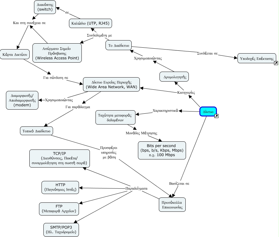 This Concept Map, created with IHMC CmapTools, has information related to: networks, Το Διαδίκτυο Συνδεδεμένη με Ασύρματο Σημείο Πρόσβασης (Wireless Access Point), Πρωτόκολλα Επικοινωνίας Παραδείγματα FTP (Μεταφορά Αρχείων), Δίκτυο Ευρείας Περιοχής (Wide Area Network, WAN) Χρησιμοποιώντας Διαμορφωτής/ Αποδιαμορφωτής (modem), Πρωτόκολλα Επικοινωνίας Παραδείγματα HTTP (Παγκόσμιος Ιστός), Τοπικό Διαδίκτυο Προσφέρει υπηρεσίες με βάση Πρωτόκολλα Επικοινωνίας, Κάρτα Δικτύου Για σύνδεση σε Δίκτυο Ευρείας Περιοχής (Wide Area Network, WAN), Δίκτυο Κατηγορίες Δρομολογητής, Το Διαδίκτυο Συνδέεται σε Υποδοχές Επέκτασης, Το Διαδίκτυο Συνδεδεμένη με Καλώδιο (UTP, RJ45), Καλώδιο (UTP, RJ45) σε Διακόπτης (switch), Ταχύτητα μεταφοράς δεδομένων Μονάδες Μέτρησης Bits per second (bps, b/s, Kbps, Mbps) π.χ. 100 Mbps, Δίκτυο Ευρείας Περιοχής (Wide Area Network, WAN) Για παράδειγμα Τοπικό Διαδίκτυο, Δίκτυο Βασίζεται σε Πρωτόκολλα Επικοινωνίας, Πρωτόκολλα Επικοινωνίας Παραδείγματα TCP/IP (Διευθύνσεις, Πακέτα/ συναρμολόγηση στη σωστή σειρά), Ασύρματο Σημείο Πρόσβασης (Wireless Access Point) Και στη συνέχεια σε Κάρτα Δικτύου, Διακόπτης (switch) Και στη συνέχεια σε Κάρτα Δικτύου, Πρωτόκολλα Επικοινωνίας Παραδείγματα SMTP/POP3 (Ηλ. Ταχυδρομείο), Δίκτυο Χαρακτηριστικά Ταχύτητα μεταφοράς δεδομένων, Δίκτυο Κατηγορίες Δίκτυο Ευρείας Περιοχής (Wide Area Network, WAN), Δρομολογητής Χρησιμοποιώντας Το Διαδίκτυο