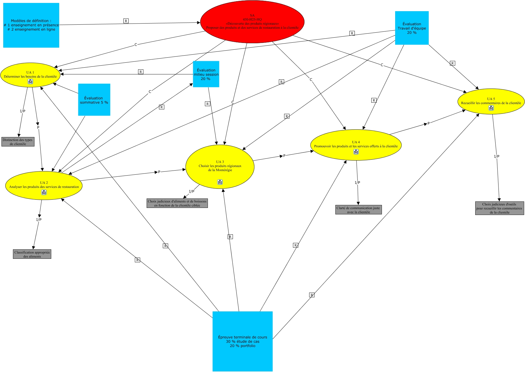 Cette carte de concepts créée avec IHMC CmapTools traite de: SA, SA 430-H25-HQ «Découverte des produits régionaux» Proposer des produits et des services de restauration à la clientèle C UA 4 Promouvoir les produits et les services offerts à la clientèle, UA 2 Analyser les produits des services de restauration I/P Classification appropriée des aliments, UA 3 Choisir les produits régionaux de la Montérégie P UA 4 Promouvoir les produits et les services offerts à la clientèle, SA 430-H25-HQ «Découverte des produits régionaux» Proposer des produits et des services de restauration à la clientèle C UA 1 Déterminer les besoins de la clientèle, SA 430-H25-HQ «Découverte des produits régionaux» Proposer des produits et des services de restauration à la clientèle C UA 3 Choisir les produits régionaux de la Montérégie, SA 430-H25-HQ «Découverte des produits régionaux» Proposer des produits et des services de restauration à la clientèle C UA 2 Analyser les produits des services de restauration, UA 2 Analyser les produits des services de restauration P UA 3 Choisir les produits régionaux de la Montérégie, UA 2 Analyser les produits des services de restauration Évaluation milieu session 20 % UA 1 Déterminer les besoins de la clientèle, UA 2 Analyser les produits des services de restauration Évaluation milieu session 20 % UA 3 Choisir les produits régionaux de la Montérégie, UA 1 Déterminer les besoins de la clientèle I/P Distinction des types de clientèle, UA 1 Déterminer les besoins de la clientèle P UA 2 Analyser les produits des services de restauration, SA 430-H25-HQ «Découverte des produits régionaux» Proposer des produits et des services de restauration à la clientèle C UA 5 Recueillir les commentaires de la clientèle, UA 3 Choisir les produits régionaux de la Montérégie I/P Choix judicieux d'aliments et de boissons en fonction de la clientèle ciblée, UA 5 Recueillir les commentaires de la clientèle I/P Choix judicieux d'outils pour recueillir les commentaires de la clientèle, UA 4 Promouvoir les produits et les services offerts à la clientèle I/P Clarté de communication juste avec la clientèle, UA 4 Promouvoir les produits et les services offerts à la clientèle P UA 5 Recueillir les commentaires de la clientèle