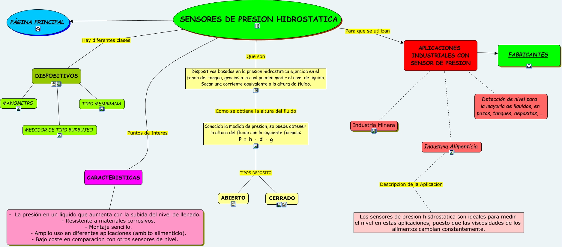 Este Cmap, tiene información relacionada con: Presion Hidrostatica, CARACTERISTICAS ???? - La presión en un líquido que aumenta con la subida del nivel de llenado. - Resistente a materiales corrosivos. - Montaje sencillo. - Amplio uso en diferentes aplicaciones (ambito alimenticio). - Bajo coste en comparacion con otros sensores de nivel., Industria Alimenticia Descripcion de la Aplicacion Los sensores de presion hisdrostatica son ideales para medir el nivel en estas aplicaciones, puesto que las viscosidades de los alimentos cambian constantemente., Conocida la medida de presion, se puede obtener la altura del fluido con la siguiente formula: P = h · d · g TIPOS DEPOSITO CERRADO, SENSORES DE PRESION HIDROSTATICA Para que se utilizan APLICACIONES INDUSTRIALES CON SENSOR DE PRESION, DISPOSITIVOS ???? TIPO MEMBRANA, DISPOSITIVOS ???? MANOMETRO, SENSORES DE PRESION HIDROSTATICA ???? PÁGINA PRINCIPAL, APLICACIONES INDUSTRIALES CON SENSOR DE PRESION ???? Industria Alimenticia, SENSORES DE PRESION HIDROSTATICA Hay diferentes clases DISPOSITIVOS, SENSORES DE PRESION HIDROSTATICA Puntos de Interes CARACTERISTICAS, APLICACIONES INDUSTRIALES CON SENSOR DE PRESION ???? FABRICANTES, SENSORES DE PRESION HIDROSTATICA Que son Dispositivos basados en la presion hidrostatica ejercida en el fondo del tanque, gracias a la cual pueden medir el nivel de liquido. Sacan una corriente equivalente a la altura de fluido., DISPOSITIVOS ???? MEDIDOR DE TIPO BURBUJEO, Dispositivos basados en la presion hidrostatica ejercida en el fondo del tanque, gracias a la cual pueden medir el nivel de liquido. Sacan una corriente equivalente a la altura de fluido. Como se obtiene la altura del fluido Conocida la medida de presion, se puede obtener la altura del fluido con la siguiente formula: P = h · d · g, APLICACIONES INDUSTRIALES CON SENSOR DE PRESION ???? Detección de nivel para la mayoría de líquidos, en pozos, tanques, depositos, ..., Conocida la medida de presion, se puede obtener la altura del fluido con la siguiente formula: P = h · d · g TIPOS DEPOSITO ABIERTO, APLICACIONES INDUSTRIALES CON SENSOR DE PRESION ???? Industria Minera