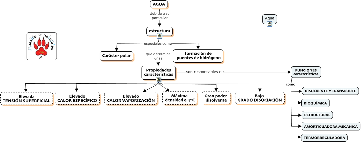 Este Cmap, tiene información relacionada con: 1.4 Propiedades del agua, estructura especiales como formación de puentes de hidrógeno, Propiedades características como Elevado CALOR VAPORIZACIÓN, FUNCIONES características como AMORTIGUADORA MECÁNICA, Propiedades características como Máxima densidad a 4ºC, FUNCIONES características como TERMORREGULADORA, Propiedades características son responsables de FUNCIONES características, Propiedades características como Elevada TENSIÓN SUPERFICIAL, FUNCIONES características como BIOQUÍMICA, Propiedades características como Gran poder disolvente, FUNCIONES características como ESTRUCTURAL, formación de puentes de hidrógeno que determina unas Propiedades características, estructura especiales como Carácter polar, Propiedades características como Elevado CALOR ESPECÍFICO, Propiedades características como Bajo GRADO DISOCIACIÓN, Carácter polar que determina unas Propiedades características, AGUA debido a su particular estructura, FUNCIONES características como DISOLVENTE Y TRANSPORTE
